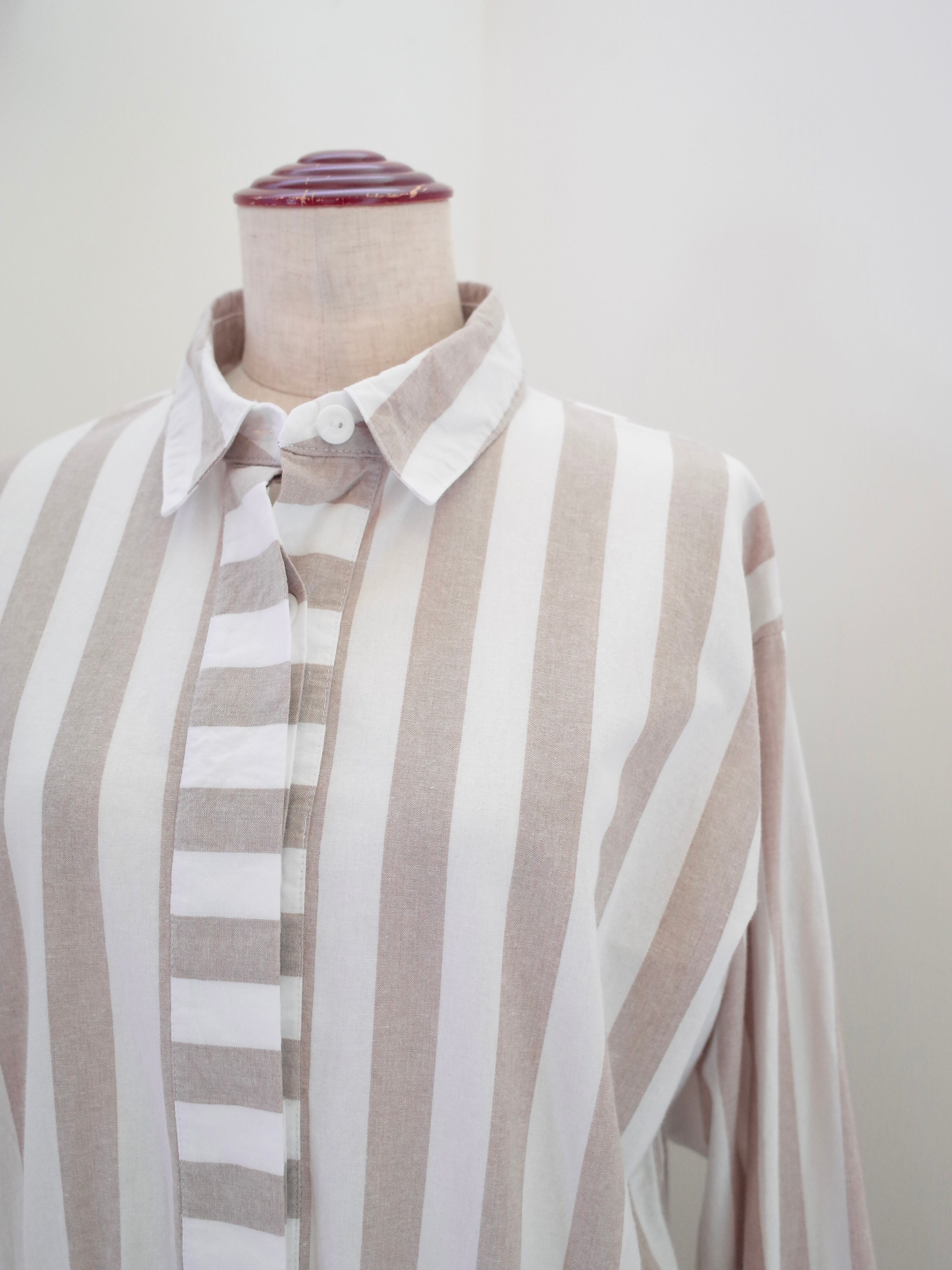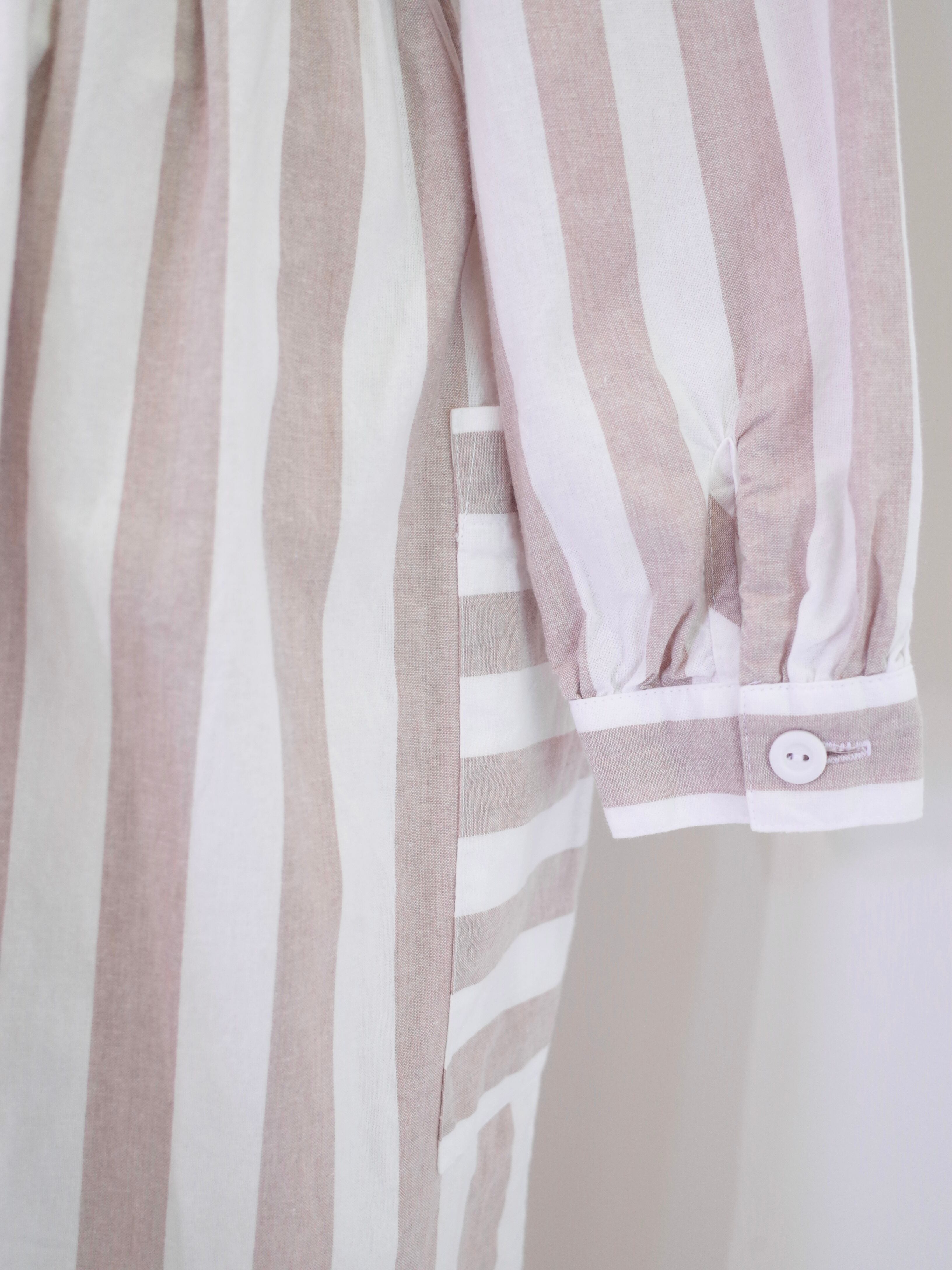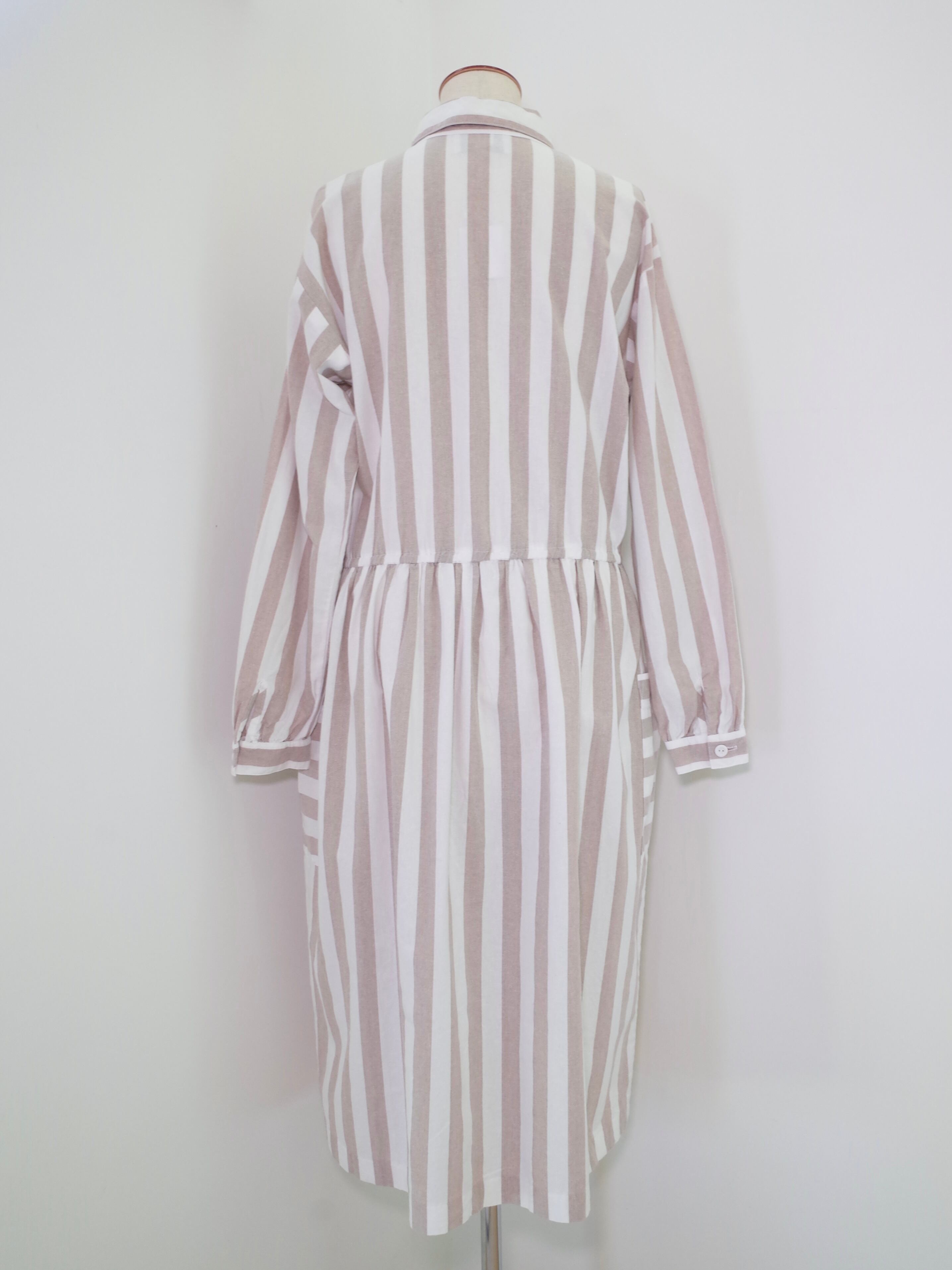 アメリカ製ストライプ柄のワンピース。ホワイト×ベージュの柔らかいカラーリングと大きなポケットが可愛いワンピース。ウエストにはゴムが入り、締め付けのない着心地の良いシルエットになっています。オールコットンの肌触りのいい軽い素材感で、デニムなどボトムと合わせてもgoodです。一枚で着用時は、裏地が付いていませんので、下にペチコートを履いて頂くと安心です。