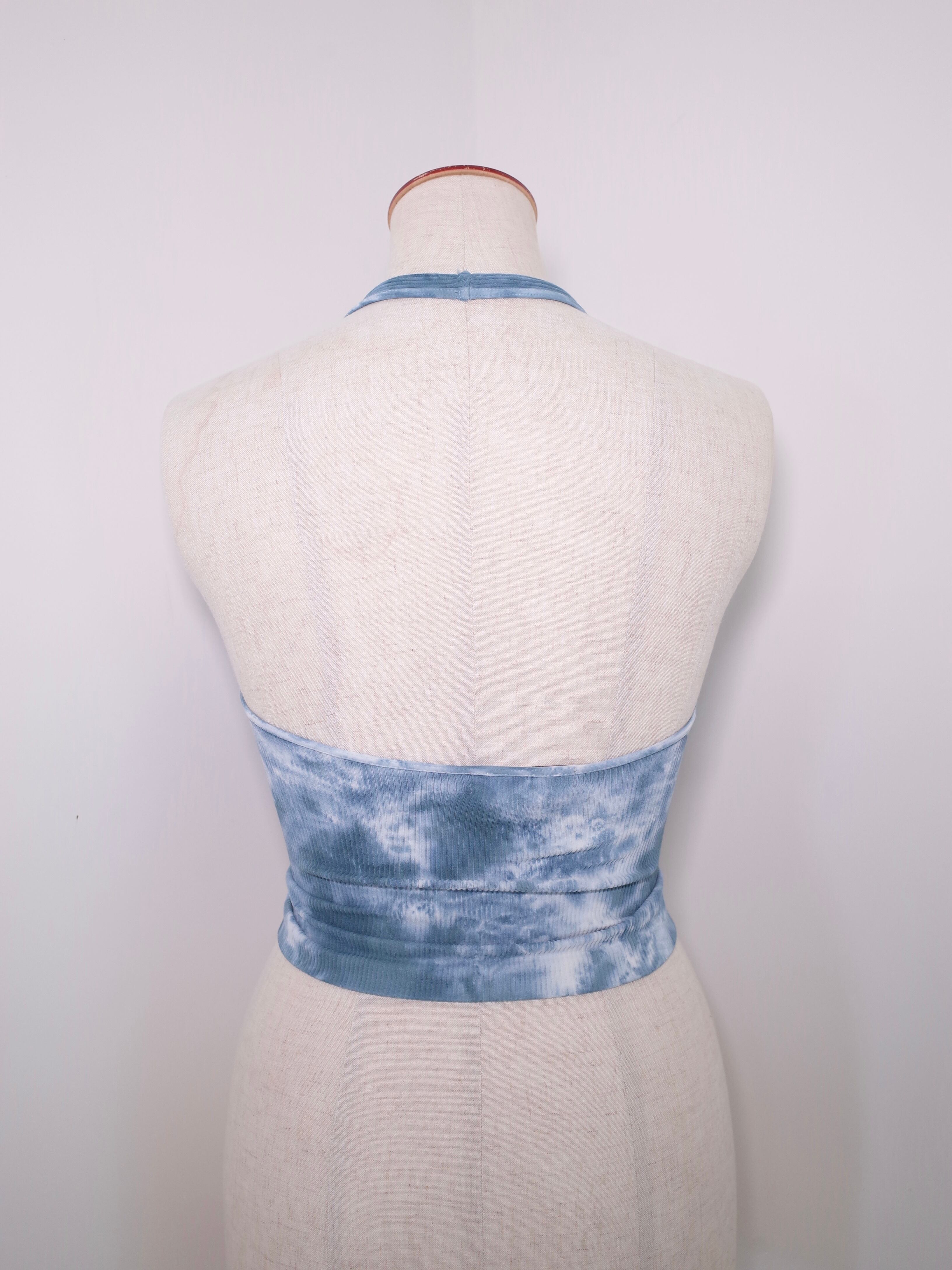 アメリカ製インディゴブルーのタイダイ染め模様がかわいいトップ。水着のような伸縮性ある素材です。これからのシーズン、インナーとしても活躍してくれます。パットは付いていません。