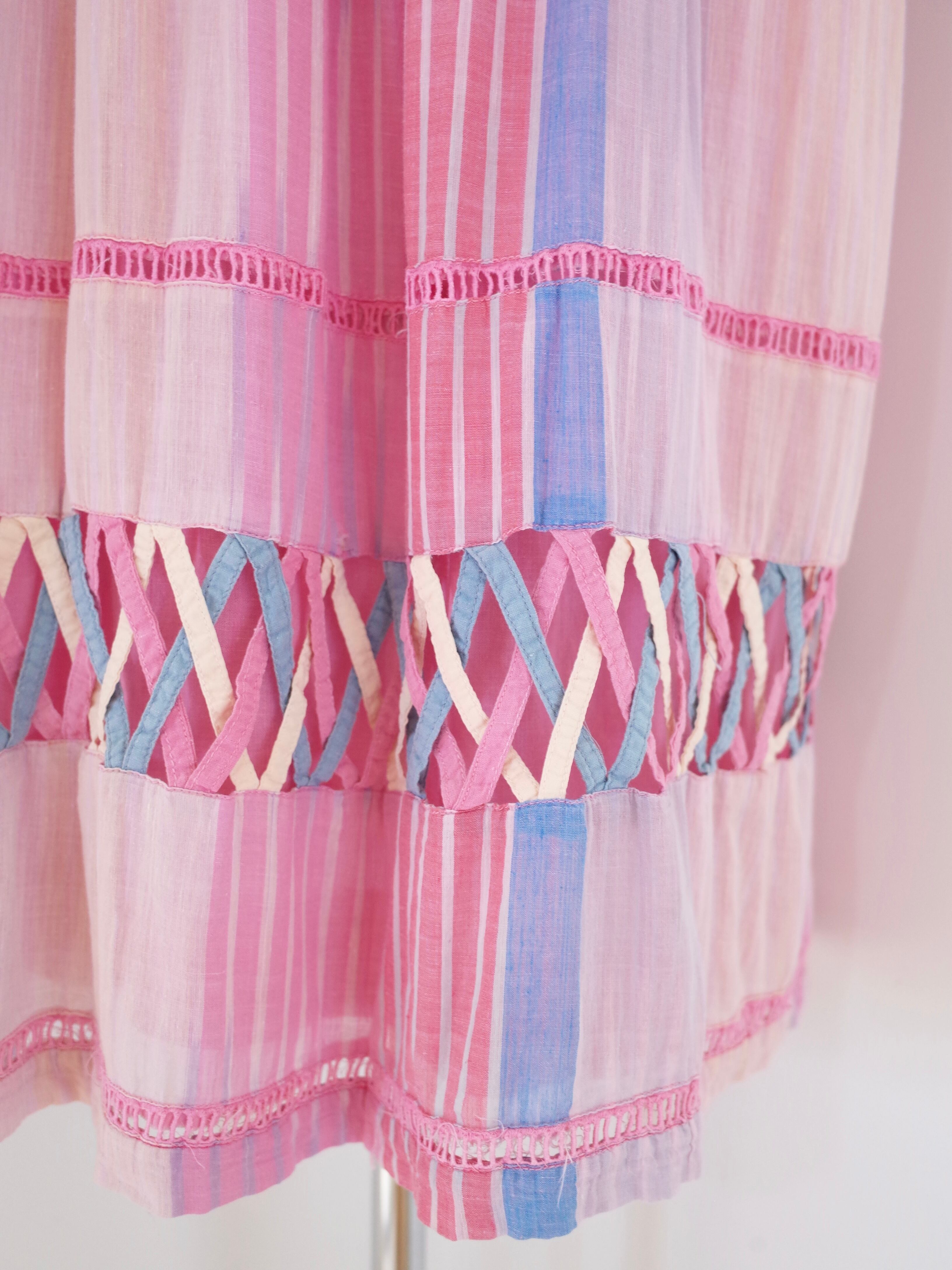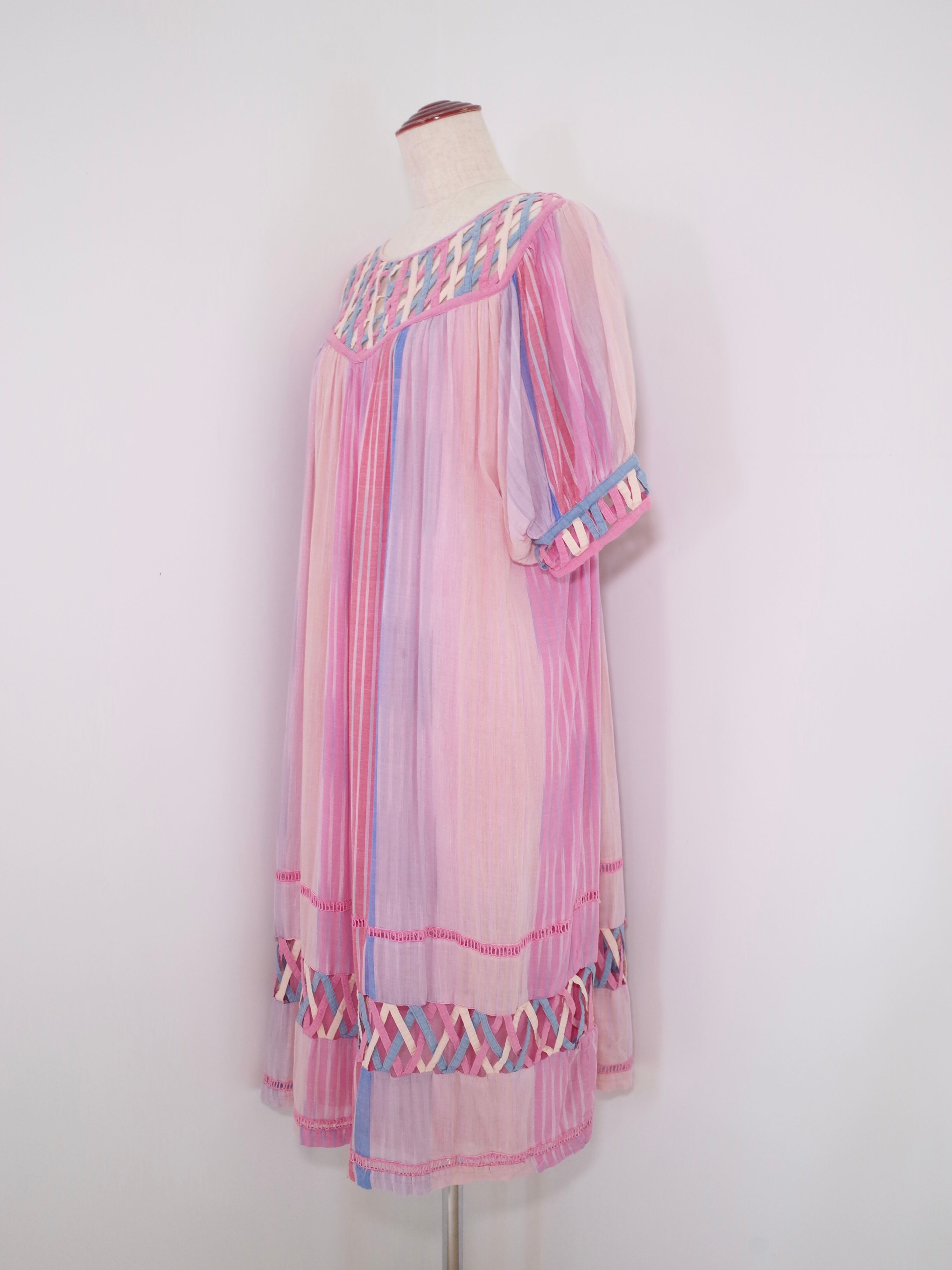 ガーゼのように軽い素材感の涼しげなワンピースです。胸元、袖、裾のデザインが可愛い一枚。ピンクやブルーのストライプの配色もgoodです。裏地が付いているので一枚で着用可能。デニムなどのボトムをレイヤーして、サンダル合わせもおすすめです。
