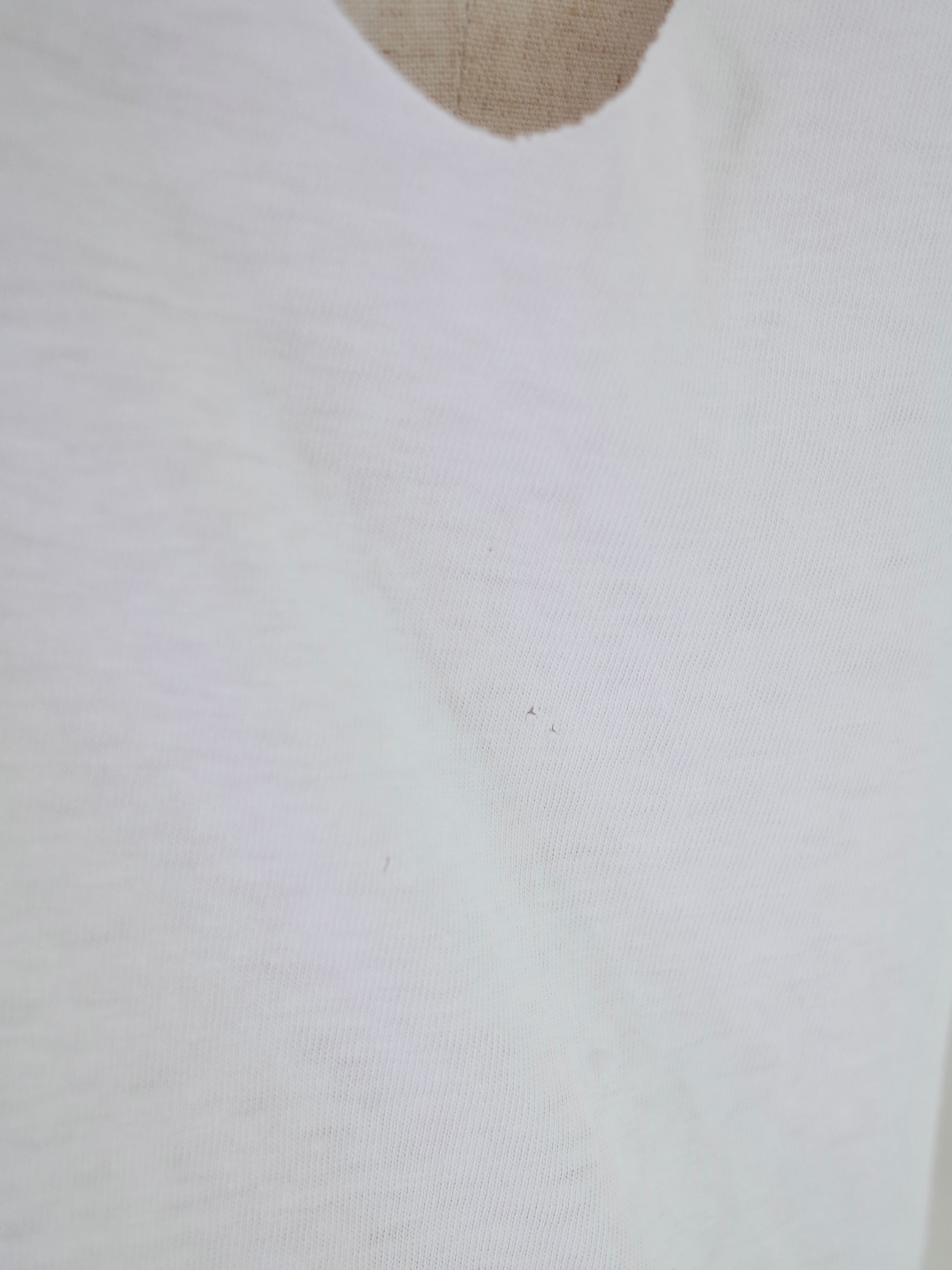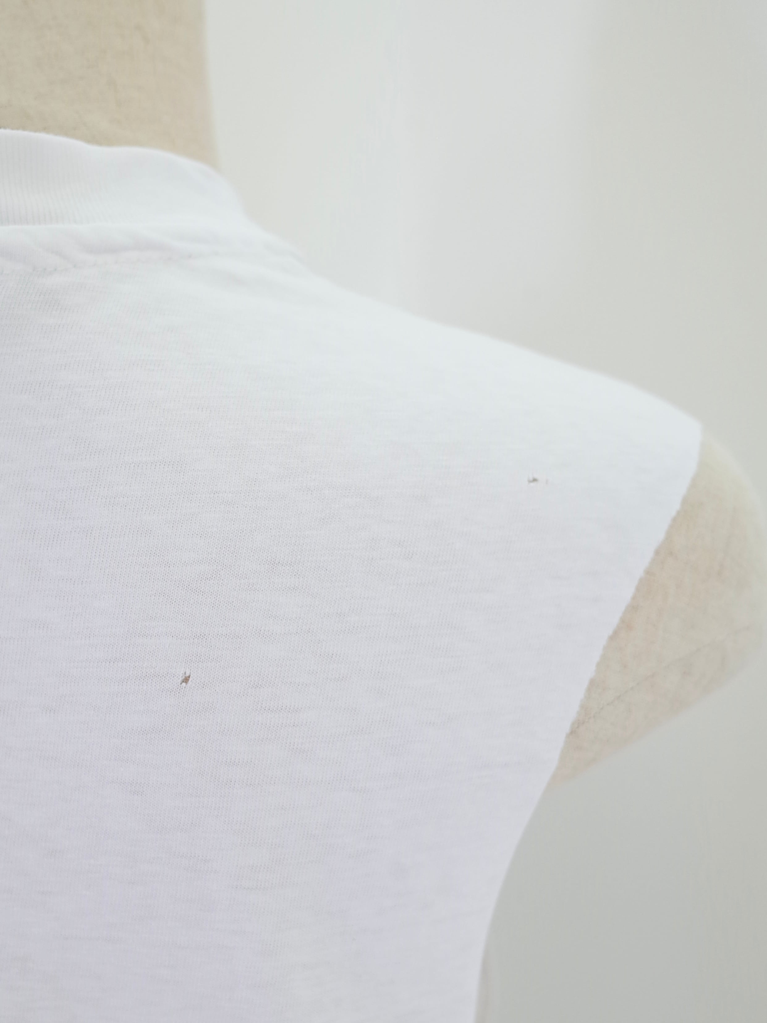 90年代アメリカ製のTシャツ。袖がカットオフされノースリーブになっています。ボディはHanesです。モノクロのプリントに、着込まれた味のある一枚です。