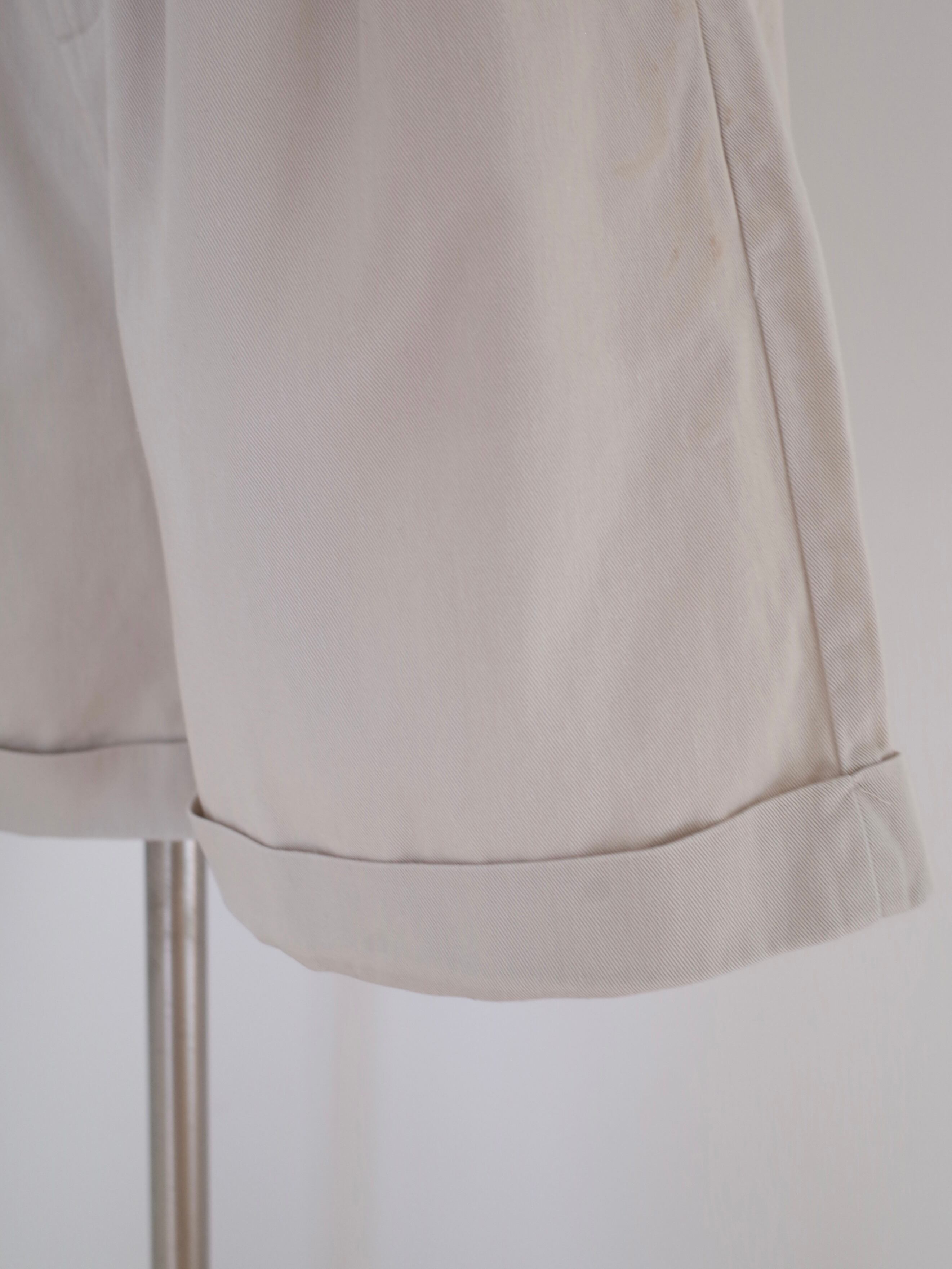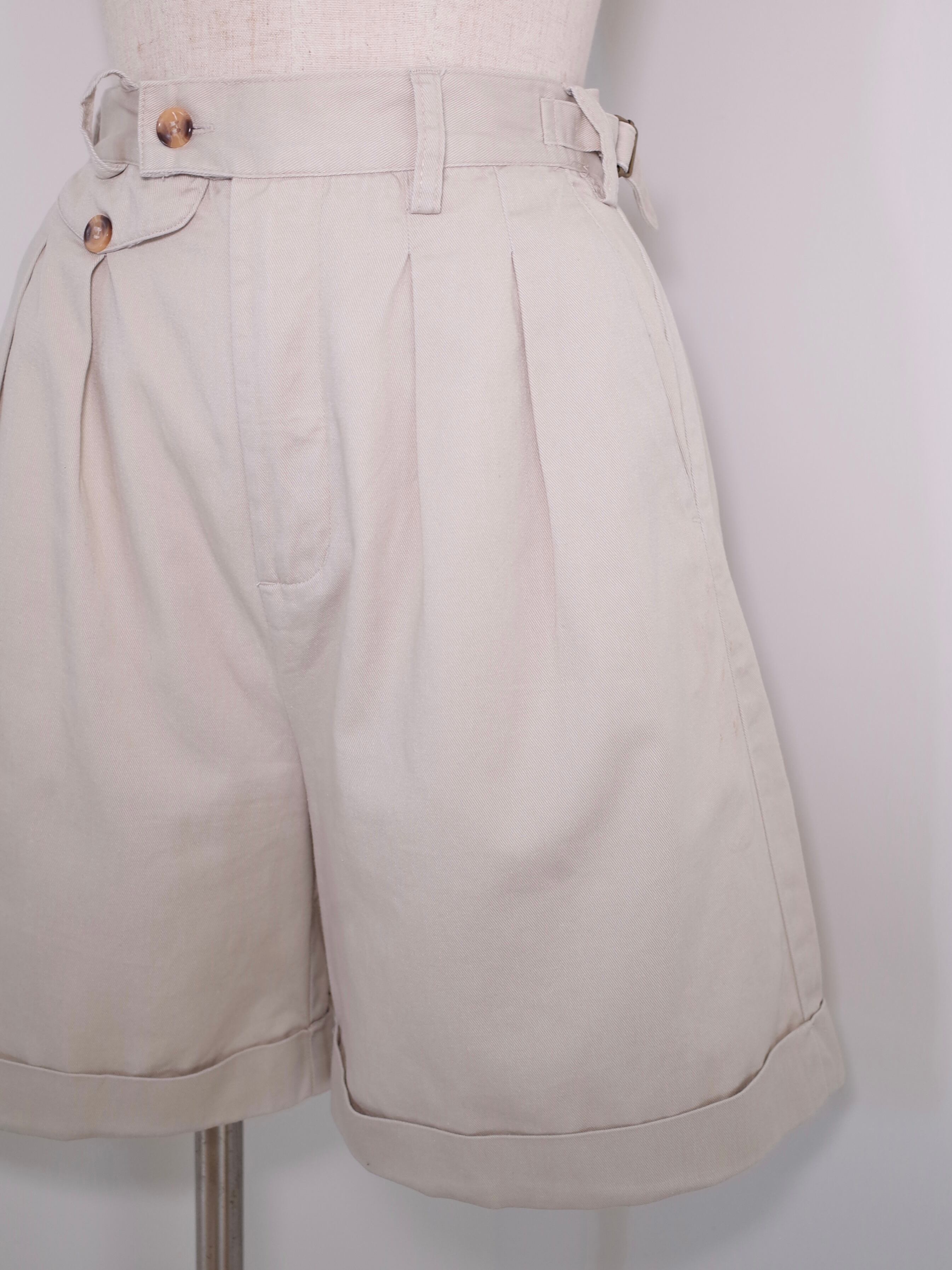 ウエストにはタックが入り、裾にかけて広がるキュロットのようなシルエットのショートパンツ。オールコットンのサラッとした履き心地で、ウエストに付いたフラップがポイントです。ウエストは少し調整可能となります。