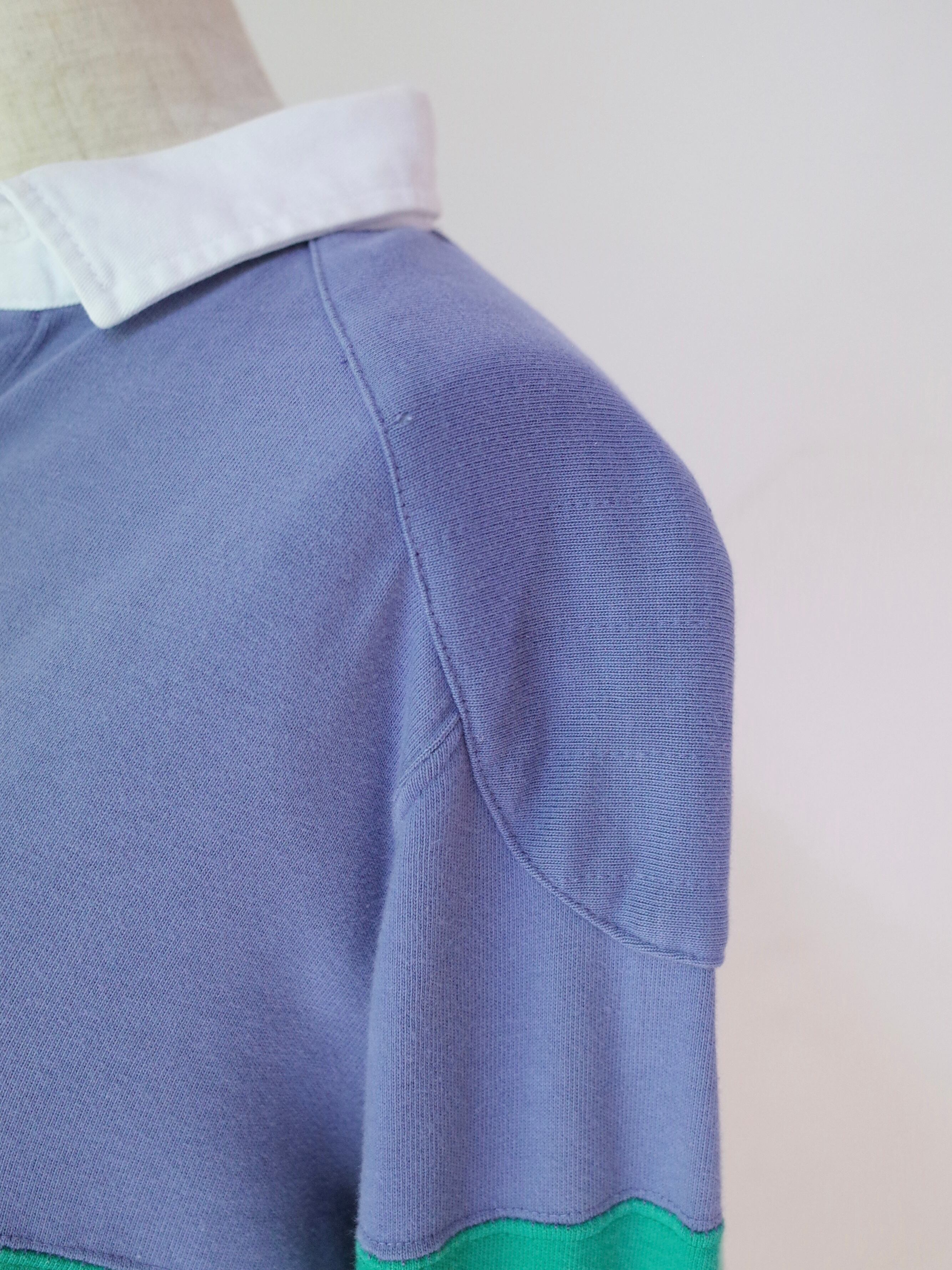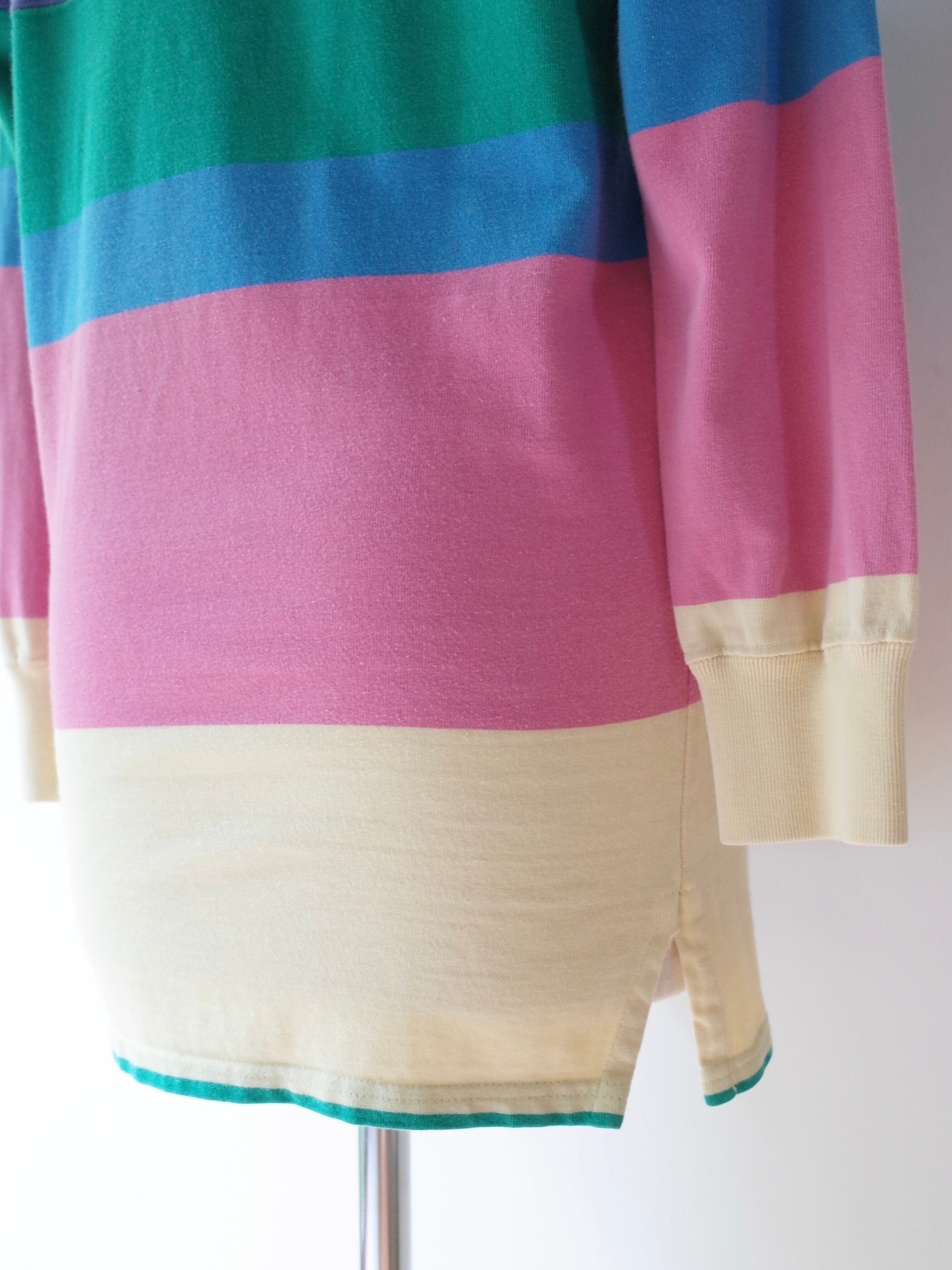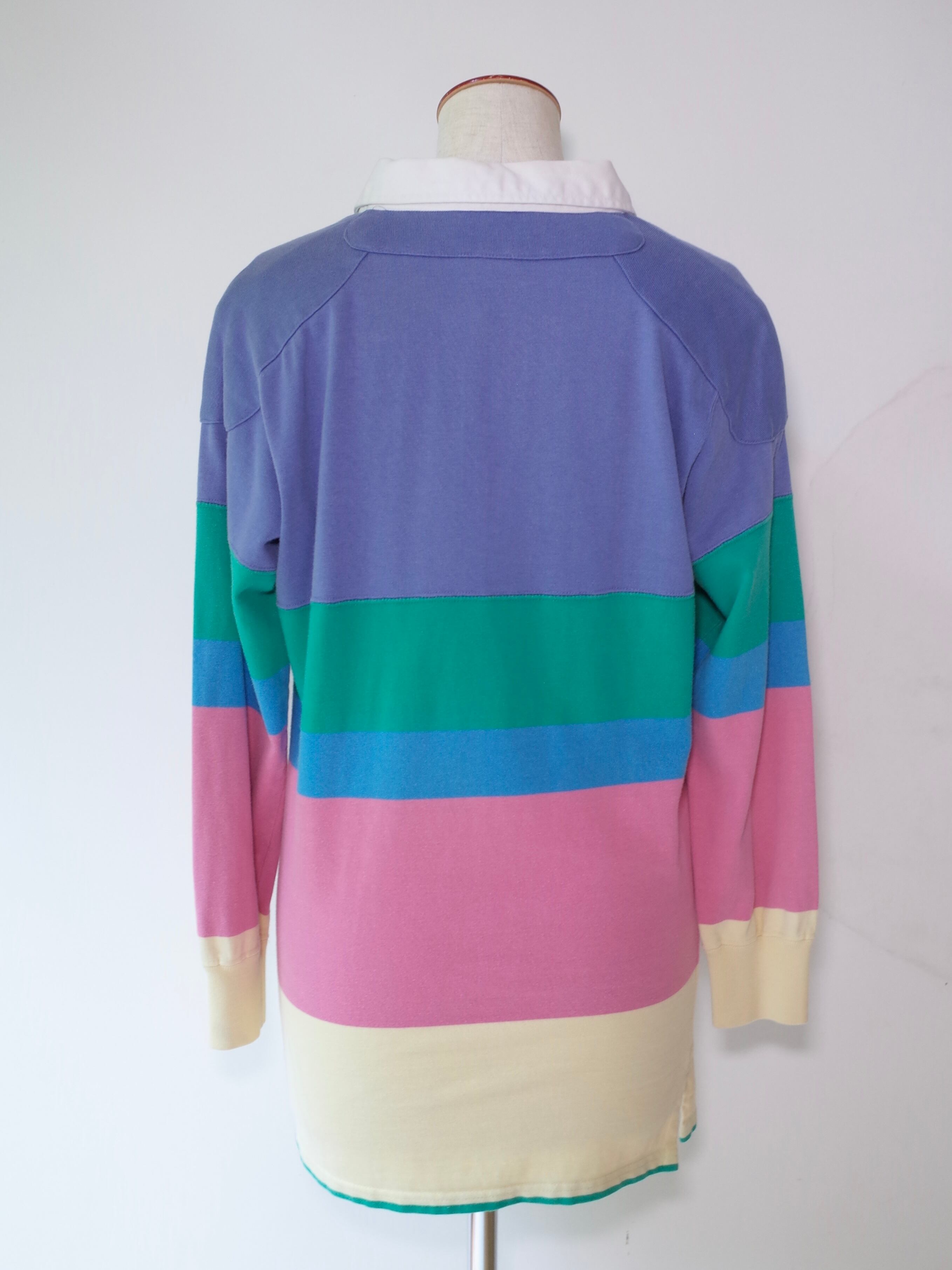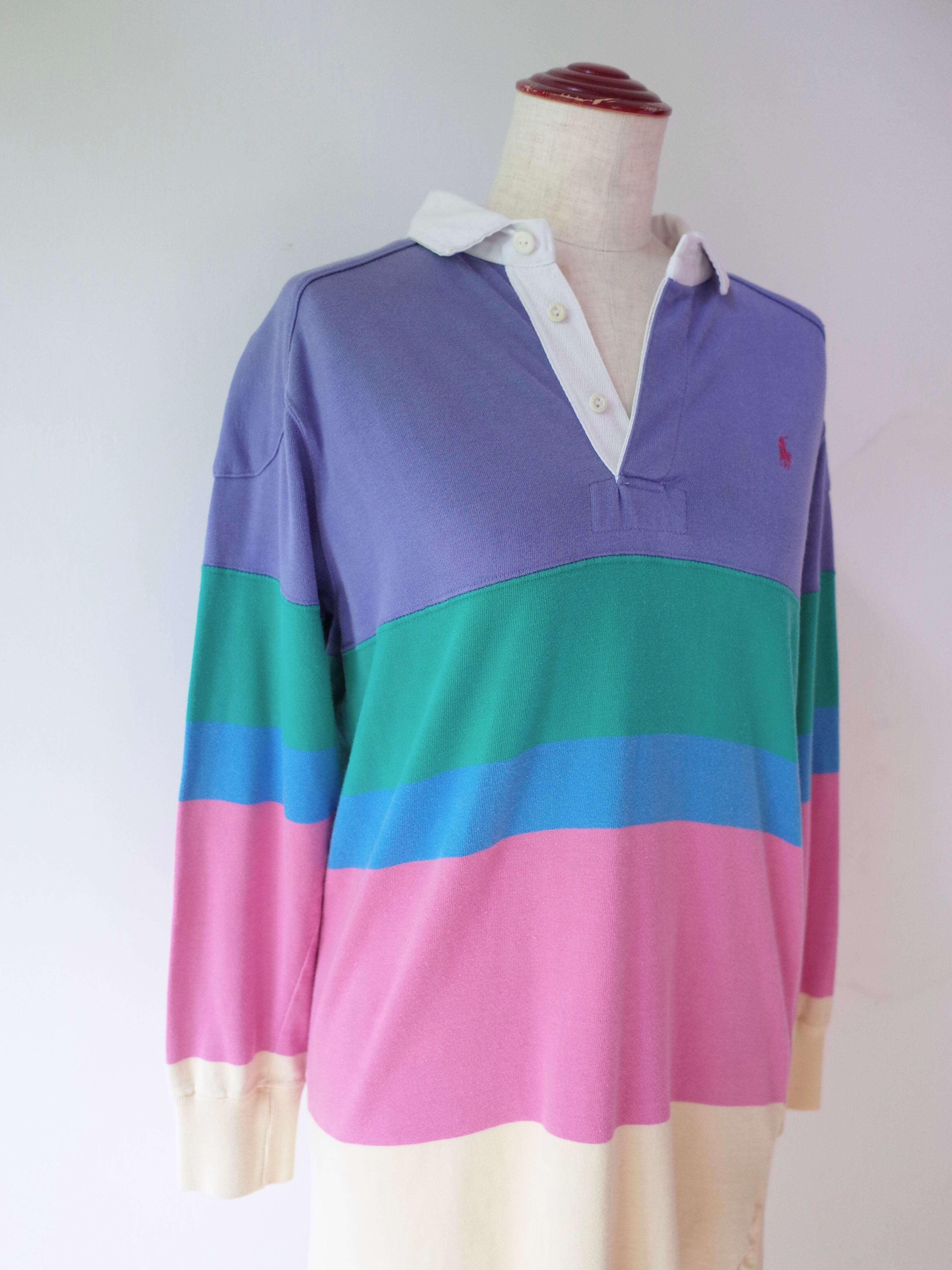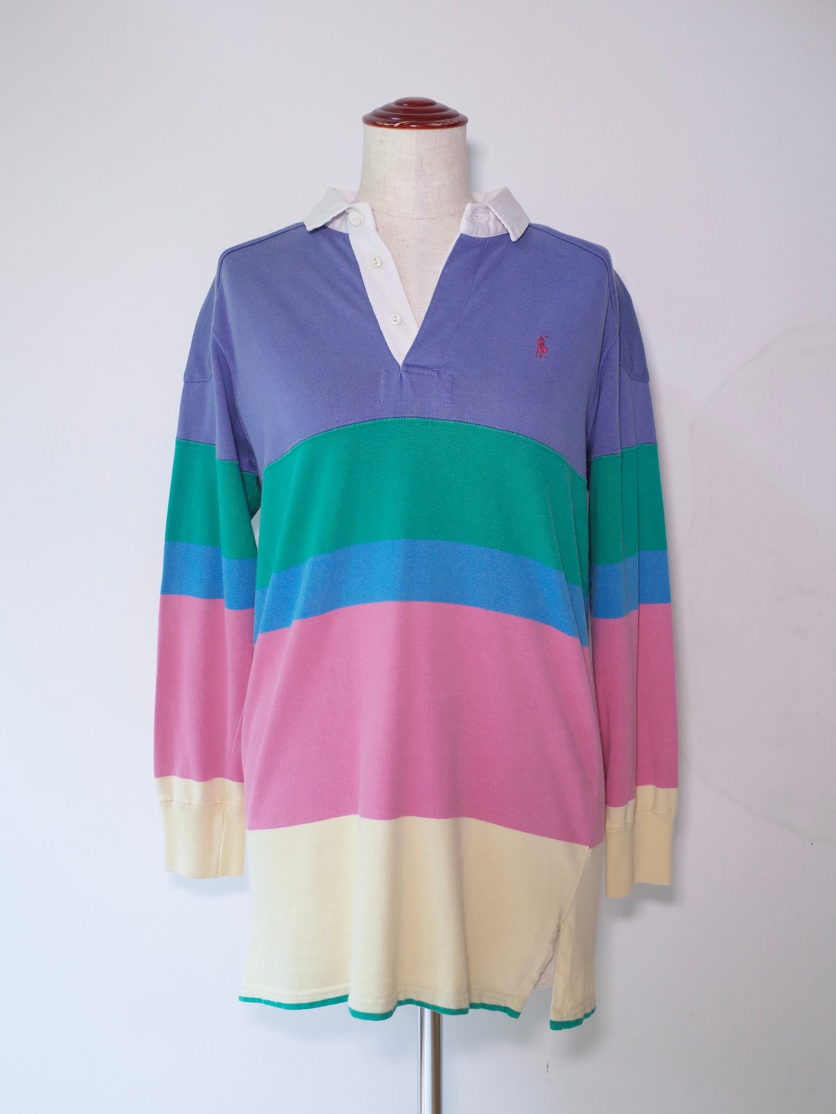 80年代製Polo Ralph Laurenのラガーシャツ。カラフルな優しい配色がかわいい一枚。ボーイズサイズですが、レディースMサイズ程度となります。ラガーシャツなので、肩の部分は生地が二重になっています。ハーフパンツを合わせたスタイリングで今っぽく◎足元はブーツと合わせて季節感を出してもGOODです。