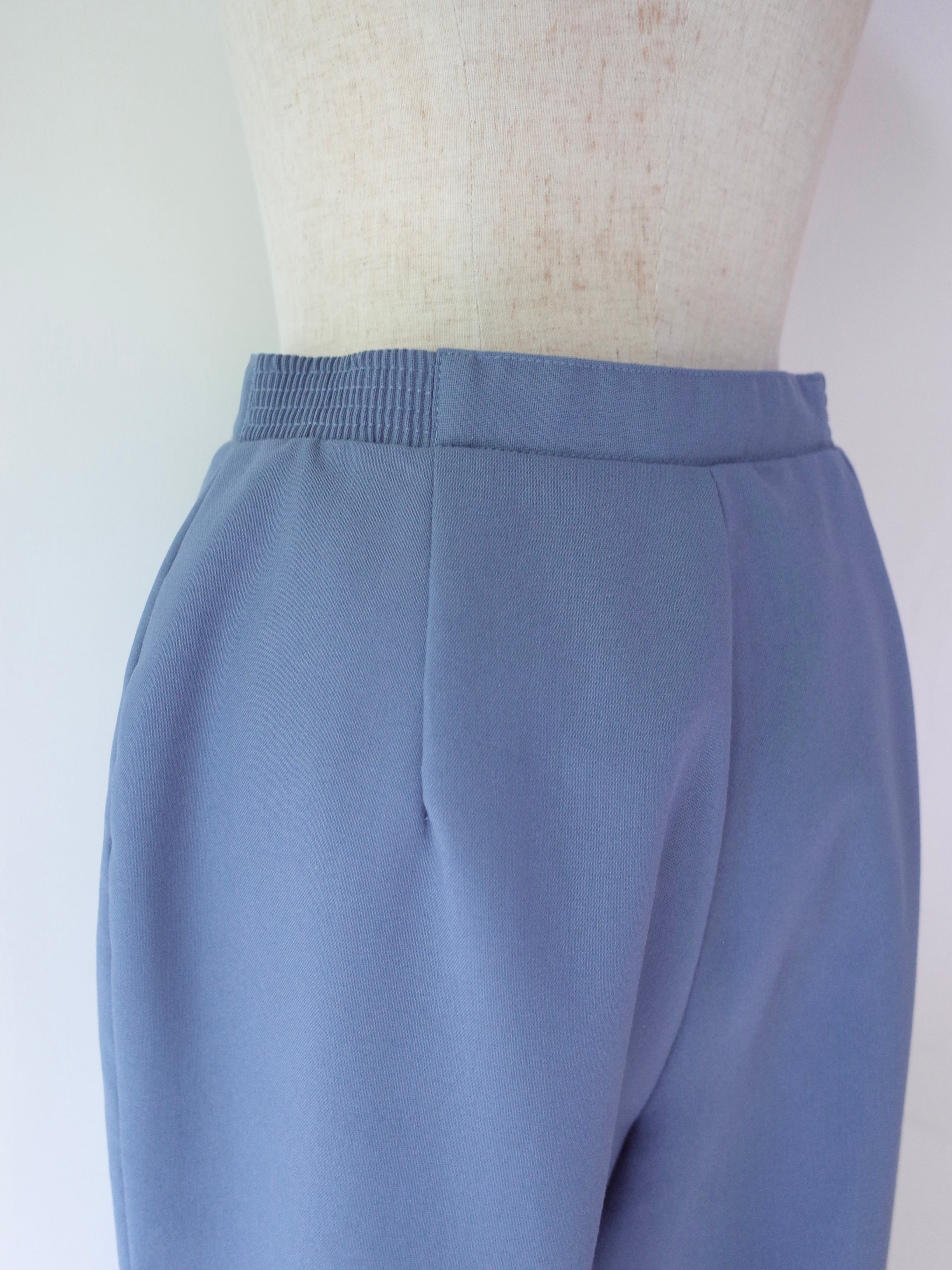 80年代アメリカ製ポリエステル素材のスラックス。くすんだライトブルーのカラーが可愛いパンツです。ハイウエストで程よいワイドストレートのレングスが、ジャケットやローゲージのニットとのバランスGOOD◎ 洗濯も気にせず出来て、シワになりにくいポリエステル素材が使い勝手の良い一本。ウエストにゴムも入っているので、履き心地も抜群です。