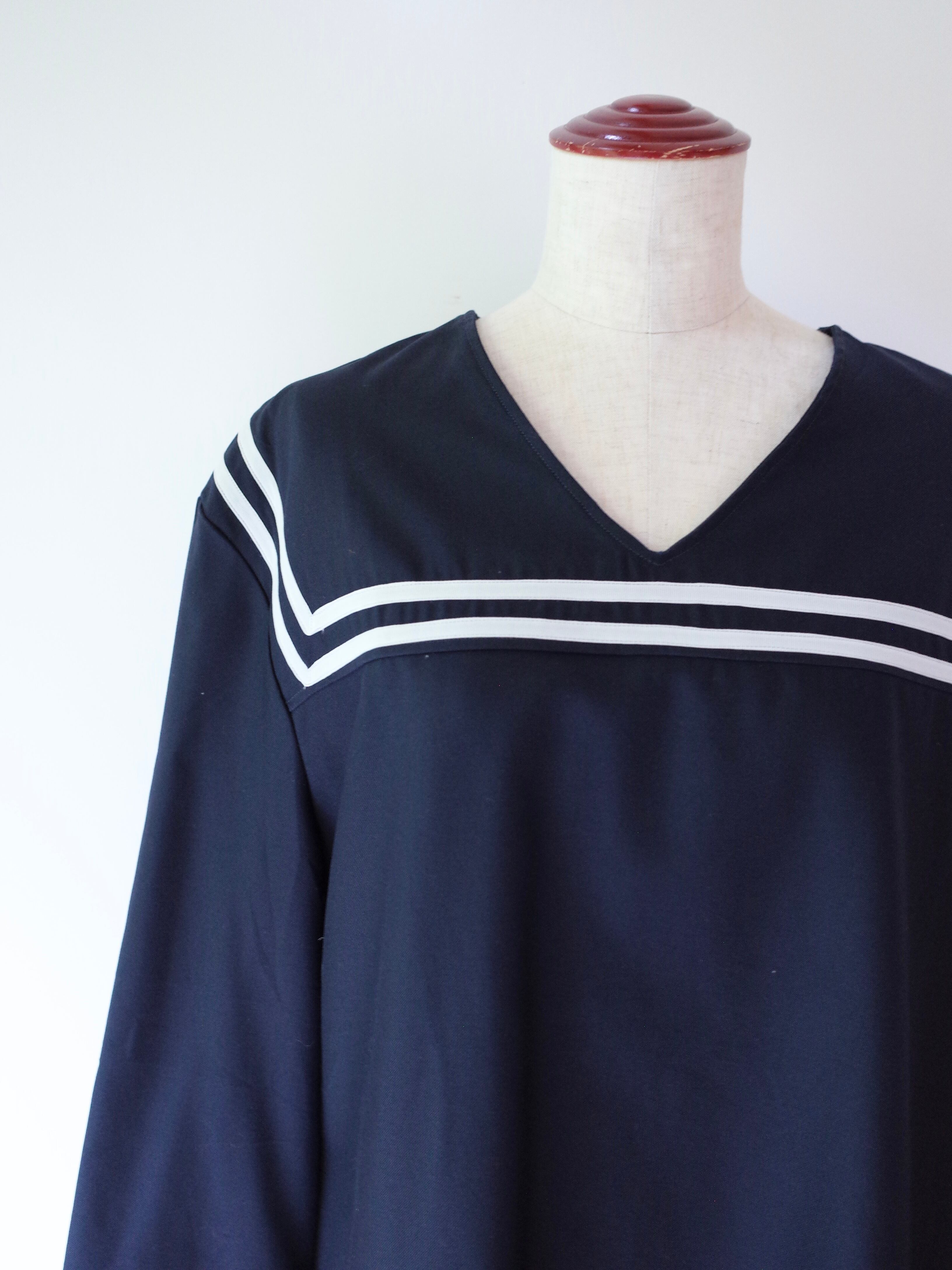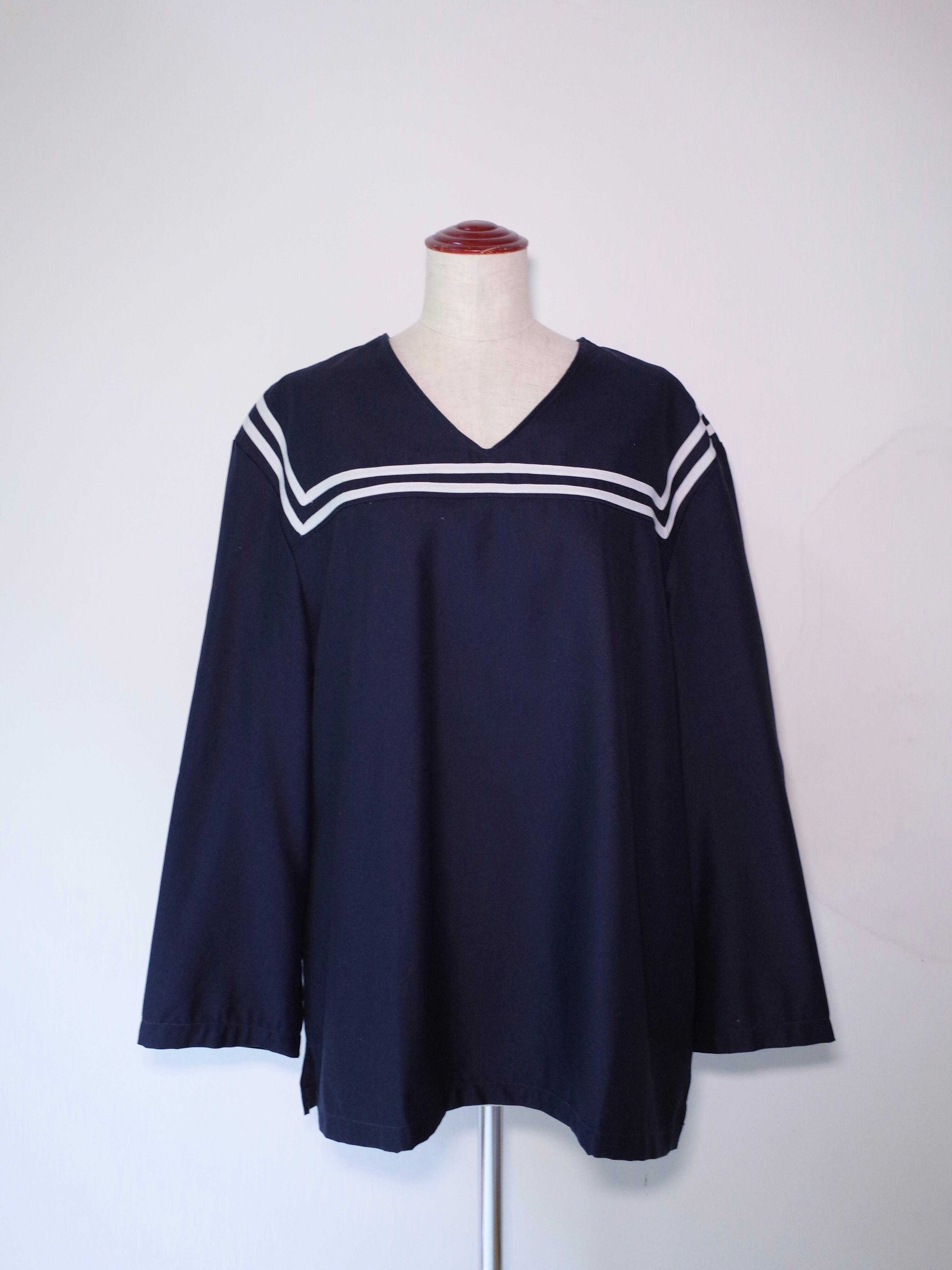 クロアチア海軍のセーラーシャツ。ネイビーカラーに白ライン。襟が一体化しているVネックのプルオーバータイプで、ゆったりとしたワイドシルエットです。デニムはもちろん、ロングスカートや綺麗目なスラックスにアクセサリーでアップデートして◎ユニセックスでおすすめな一着です。