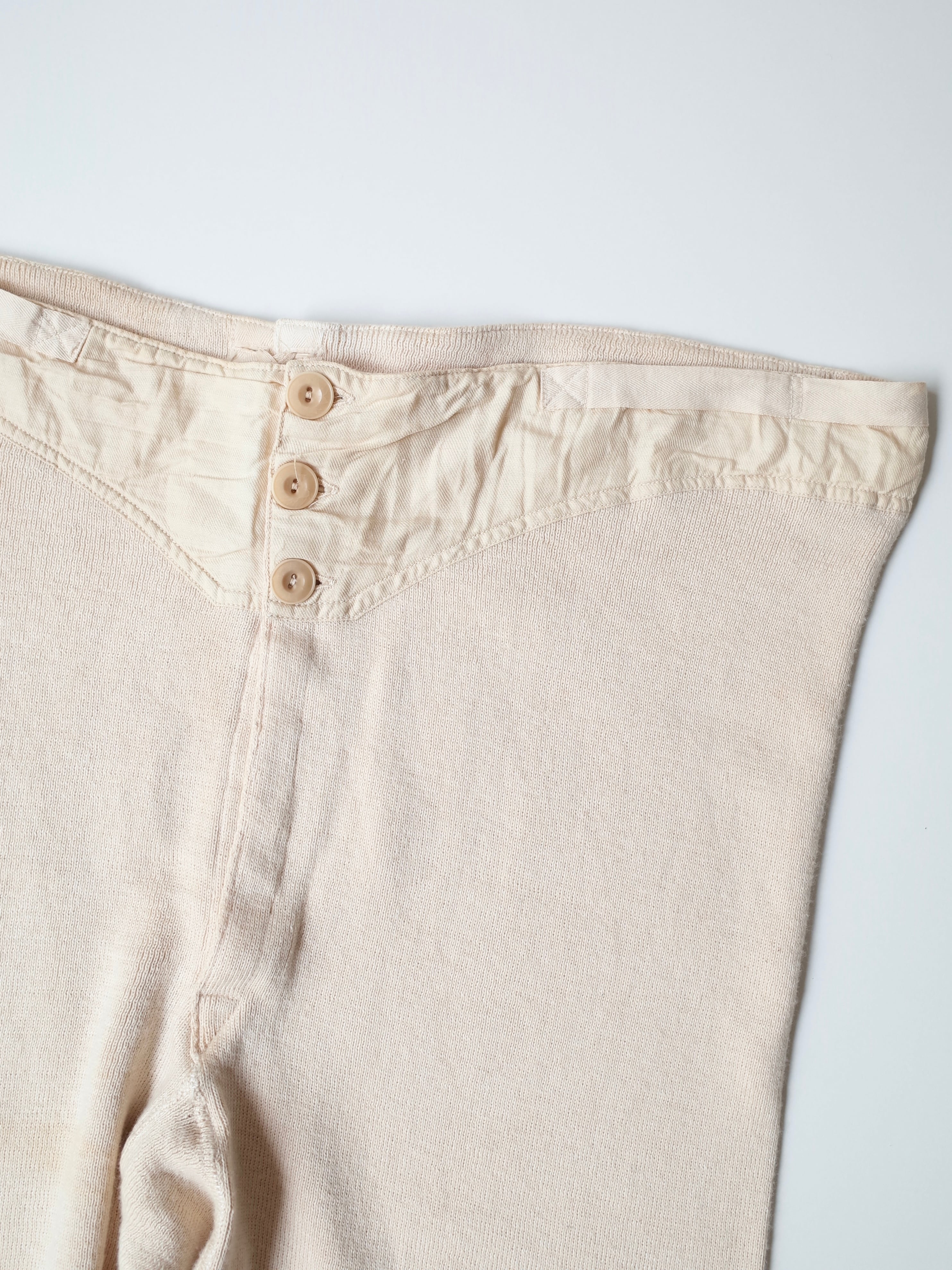 1950〜60年代製スイス軍のアンダーパンツです。とても柔らかく肌触りの良い、伸縮性のある生地感。バックはレースアップになった可愛いルックスで、裾リブに向かって綺麗にテーパードした細身のシルエットです。レギンスのようにスカートやワンピースにレイヤーして◎