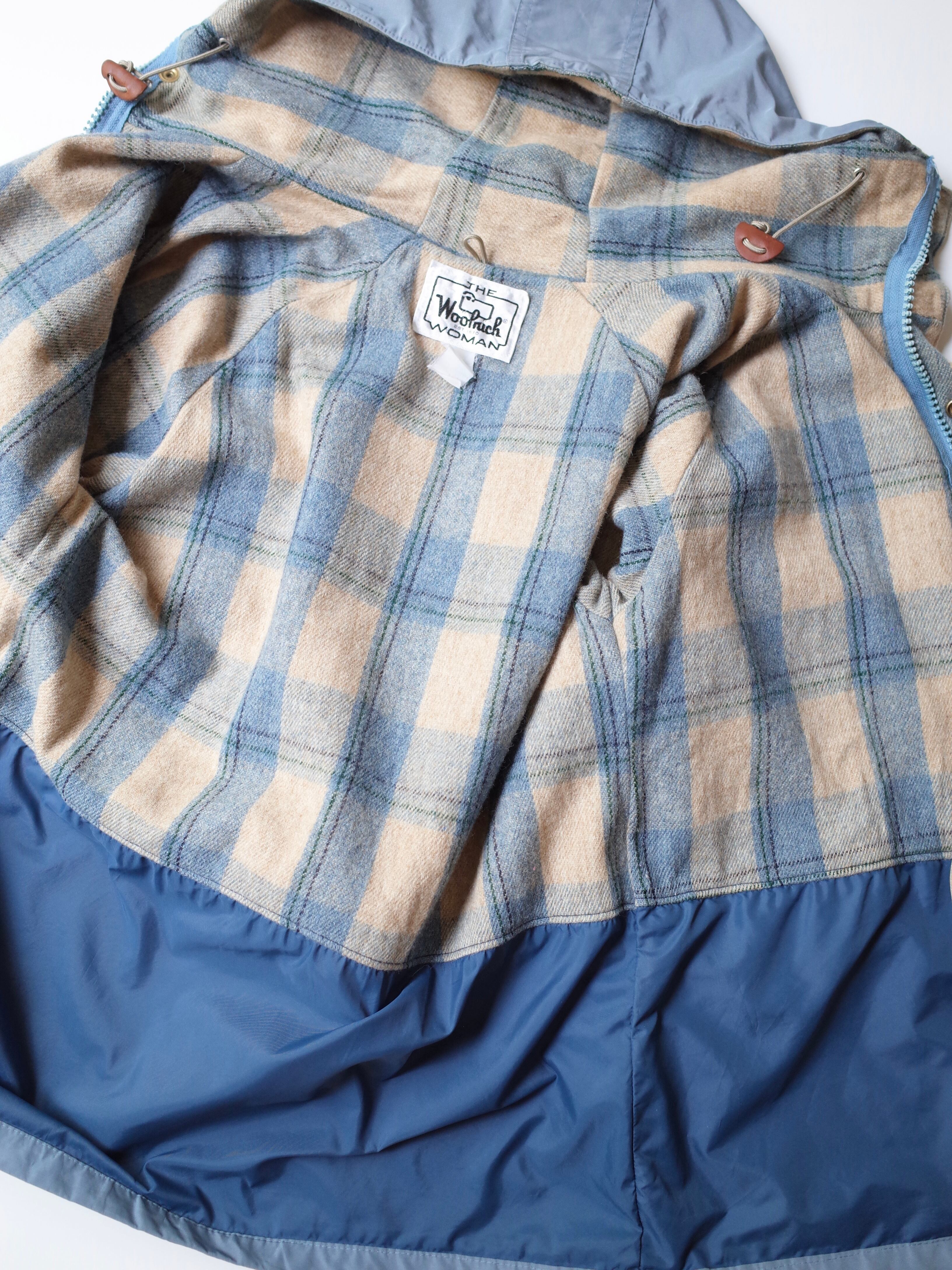 70年代アメリカ製Woolrich WOMANのマウンテンパーカー。お尻まで隠れる長めの着丈と、内側はウールのライナーで暖かいジャケット。シェルのライトブルーのカラーと、ライナーの淡いチェックの配色がGOODな一枚です。