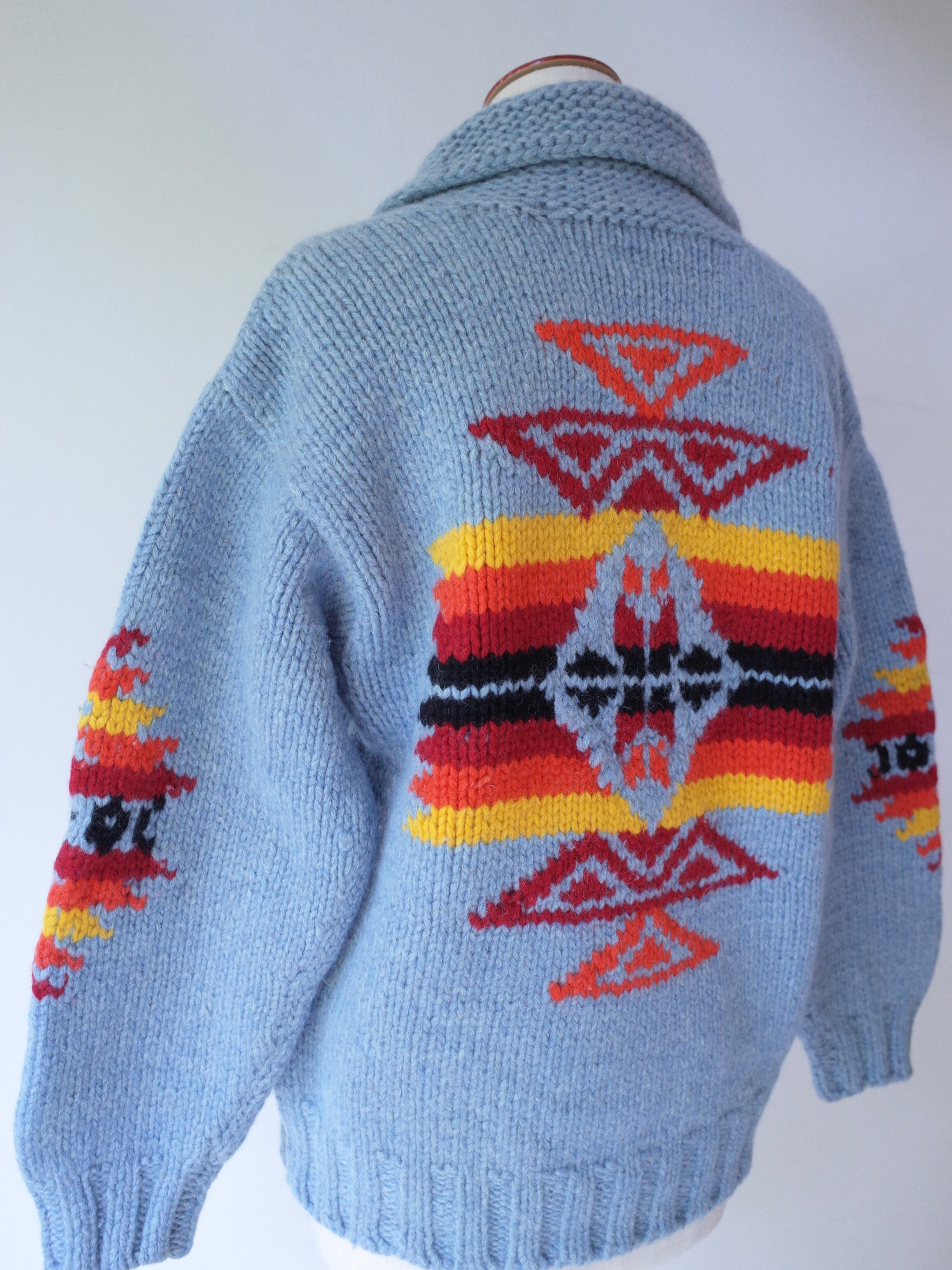 ネイティブ柄が目を惹く、ローゲージニットのセーター。ベースのライトブルーのカラーもいい色です。ショールカラーにウッドトグルボタンのディテールも◎アウターのように着られる肉厚なニットです。