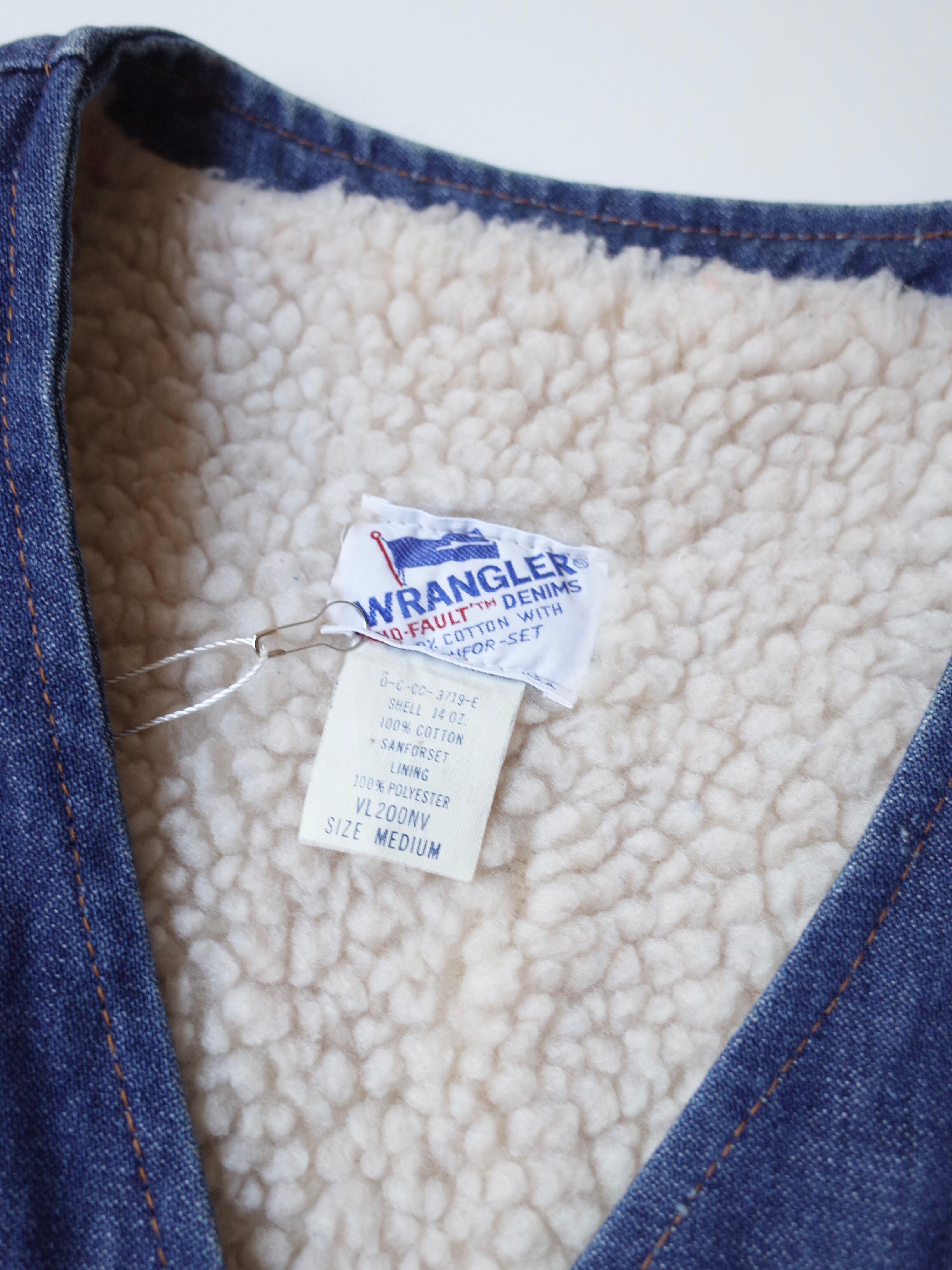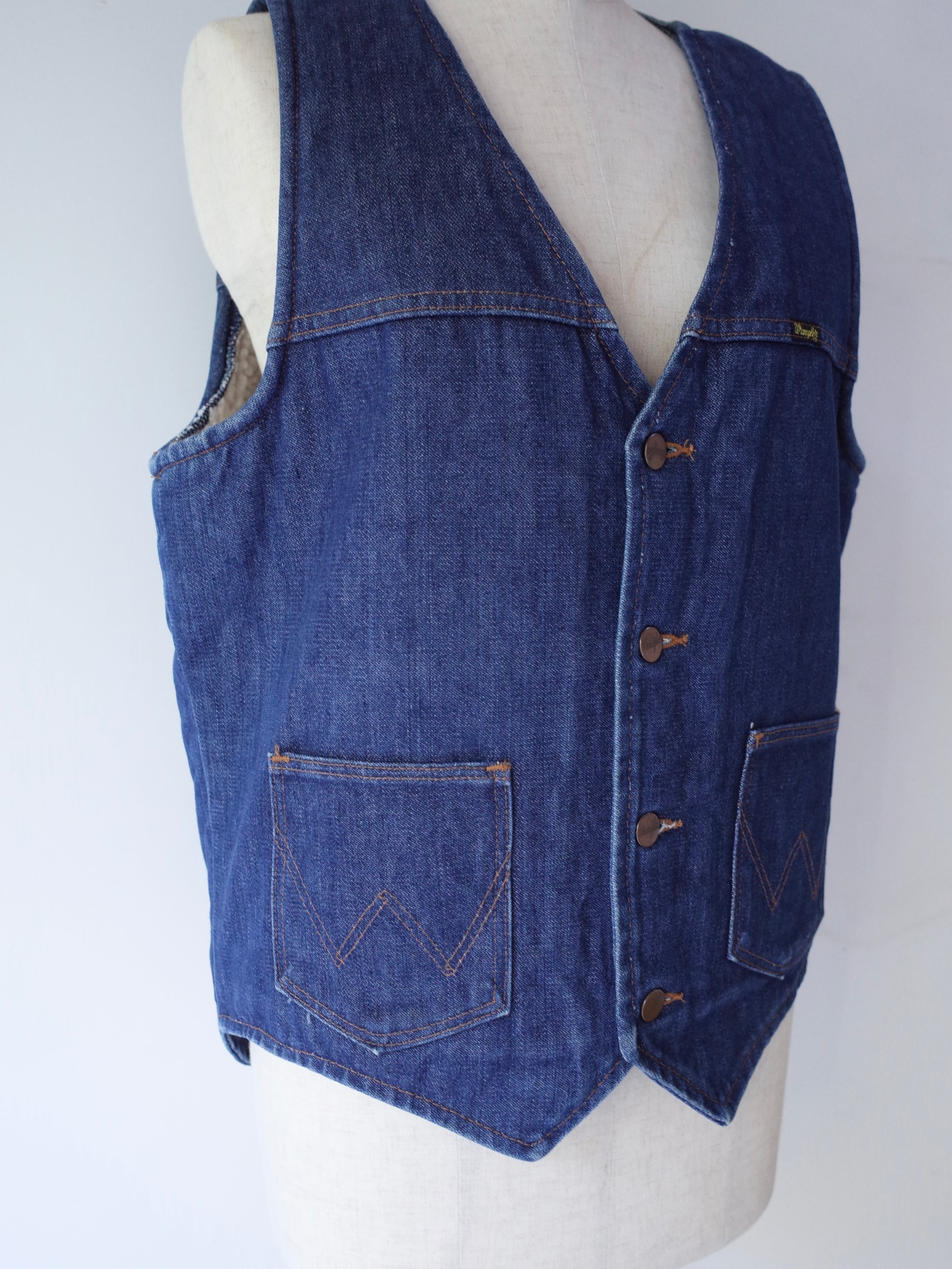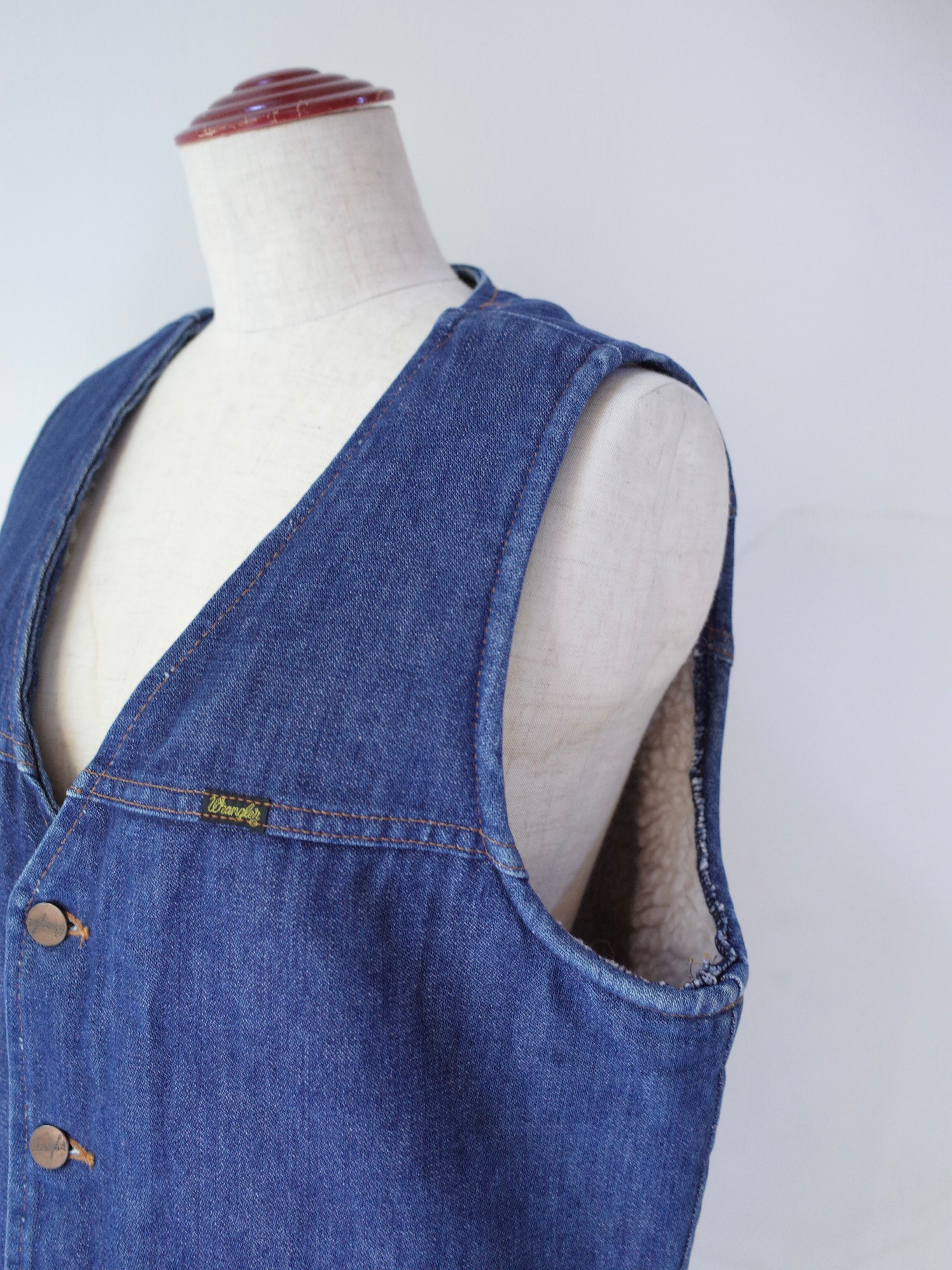 70年代アメリカ製Wranglerのデニムボアベスト。スウェットやニットの上から羽織ったり、ジャケットやコートの下に着たりと幅広いレイヤードスタイルが楽しめるベスト。いつものスタイリングにちょっと取り入れるだけで、ランチの雰囲気を程よく足せる気の利いたアイテムです。