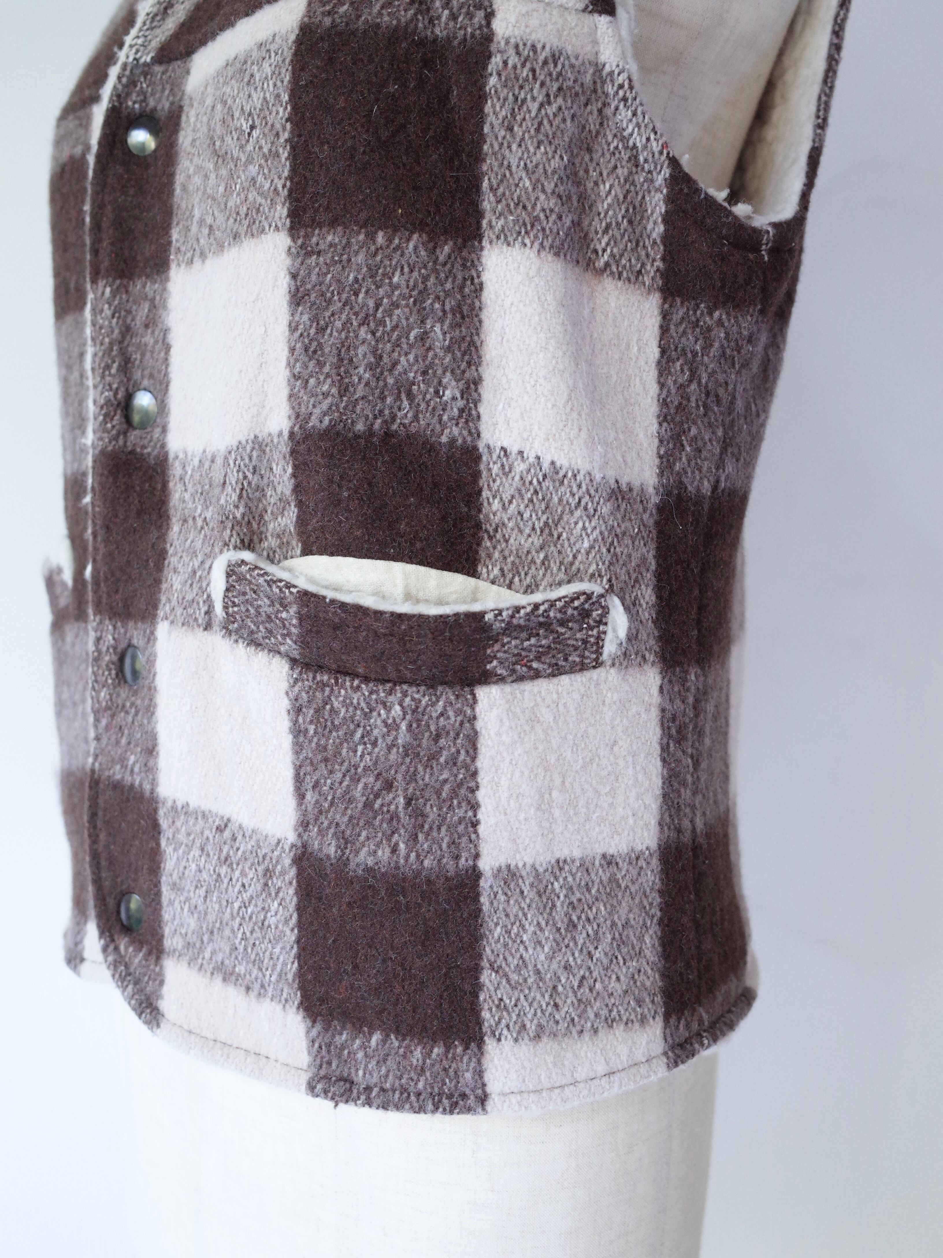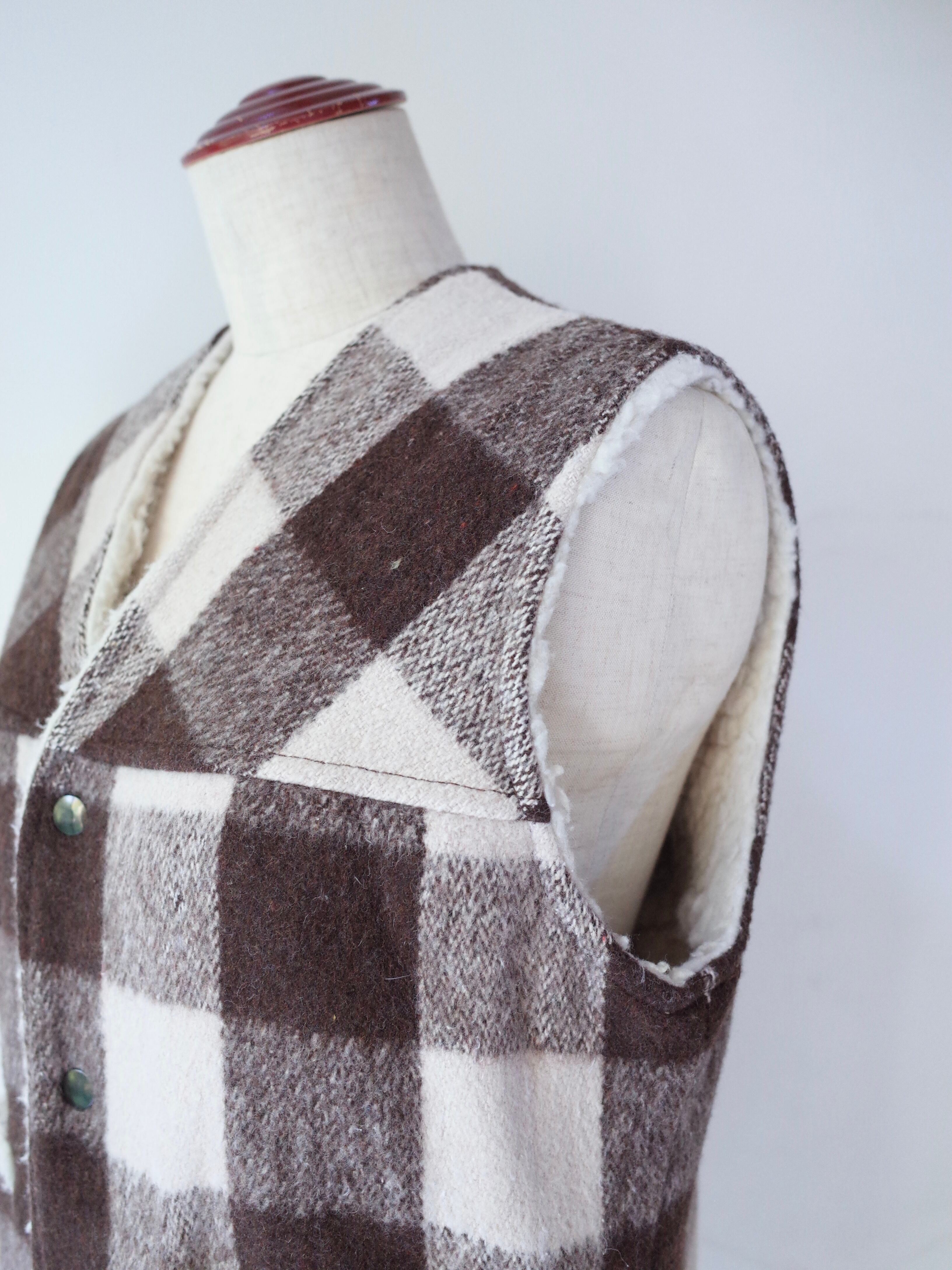 70年代製JCPenneyのボアベスト。ブラウンと薄らピンクがかったホワイトの好配色のチェック柄が可愛い一枚です。スウェットやニットの上から羽織ったり、ジャケットやコートの下に着たりと幅広いレイヤードスタイルが楽しめるベスト。いつものスタイリングにちょっと取り入れるだけで、ランチの雰囲気を程よく足せる気の利いたアイテムです。