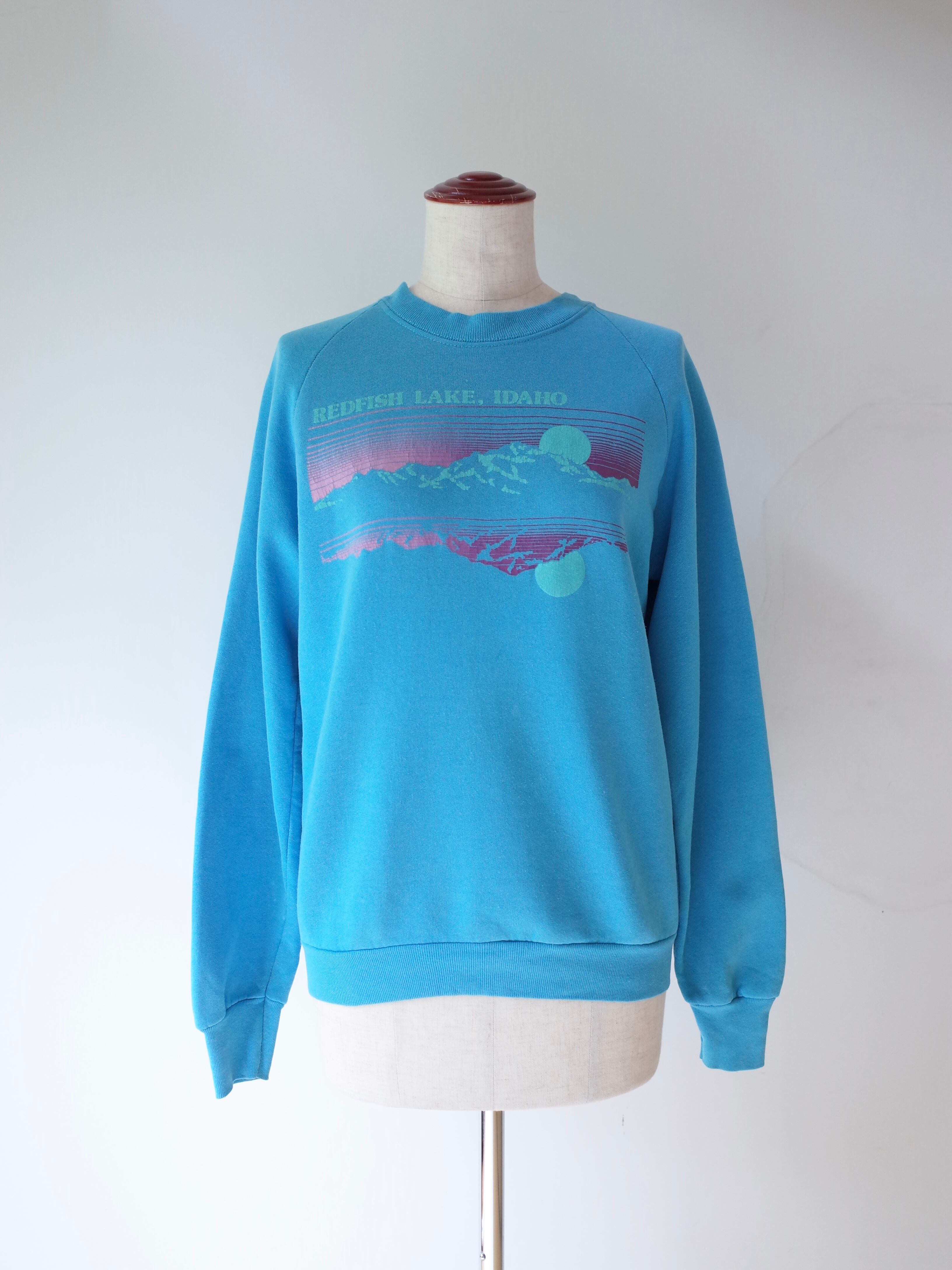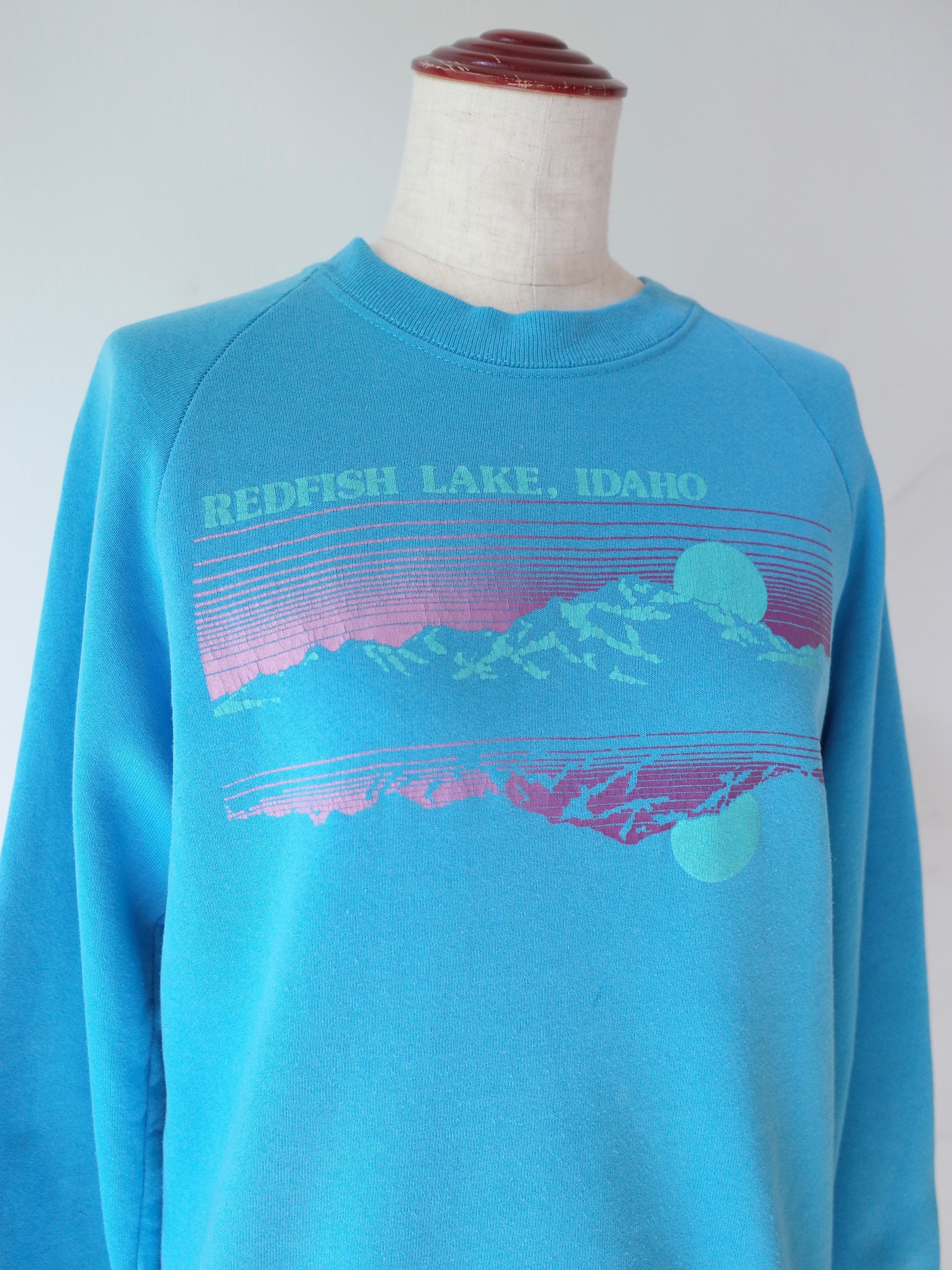 80年代アメリカ製アイダホ州にあるレッドフィッシュ湖のスーベニアスウェット。ボディはFRUITS OFF THE LOOMです。ターコイズブルーのボディにグラデーションカラーのプリントがGOODな一枚です。