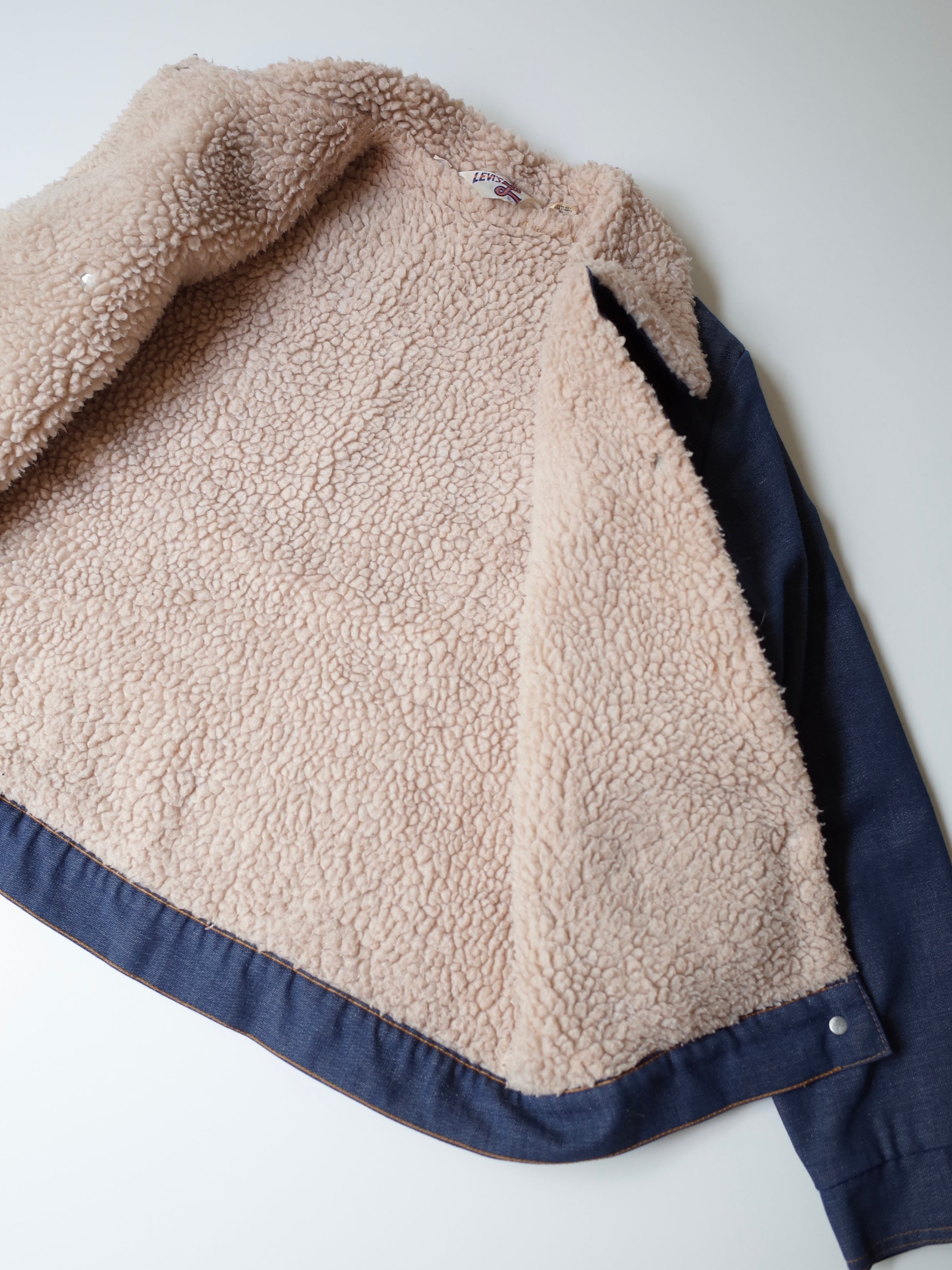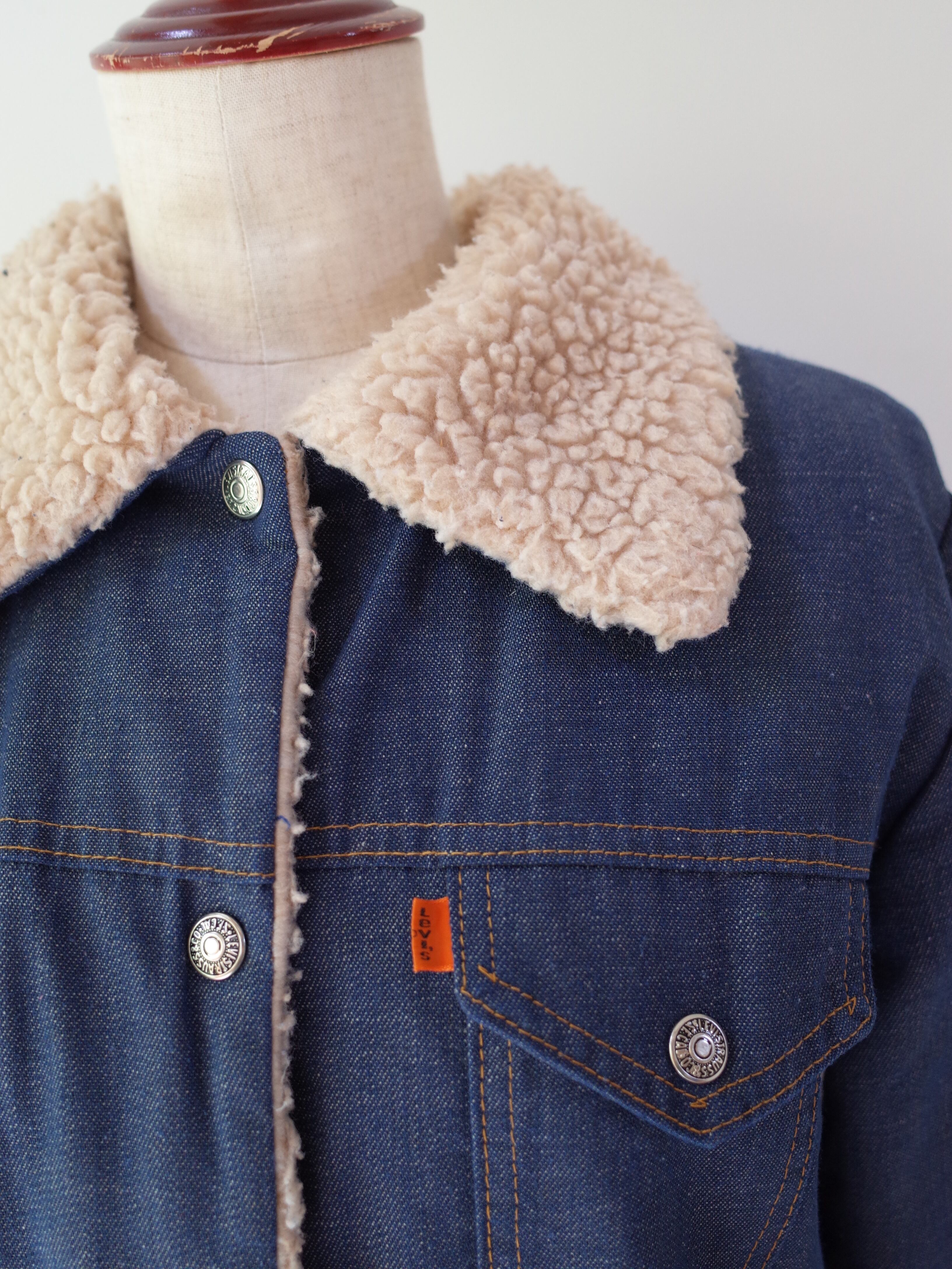 70年代製リーバイスのレディースラインのデニムボアジャケットです。内側は肉厚のボアで、袖はキルティング仕様。温かいので防寒としても◎濃いデニムにキナリホワイトのボアがよく映え、Gジャンとはまた違った魅力のあるジャケットです。