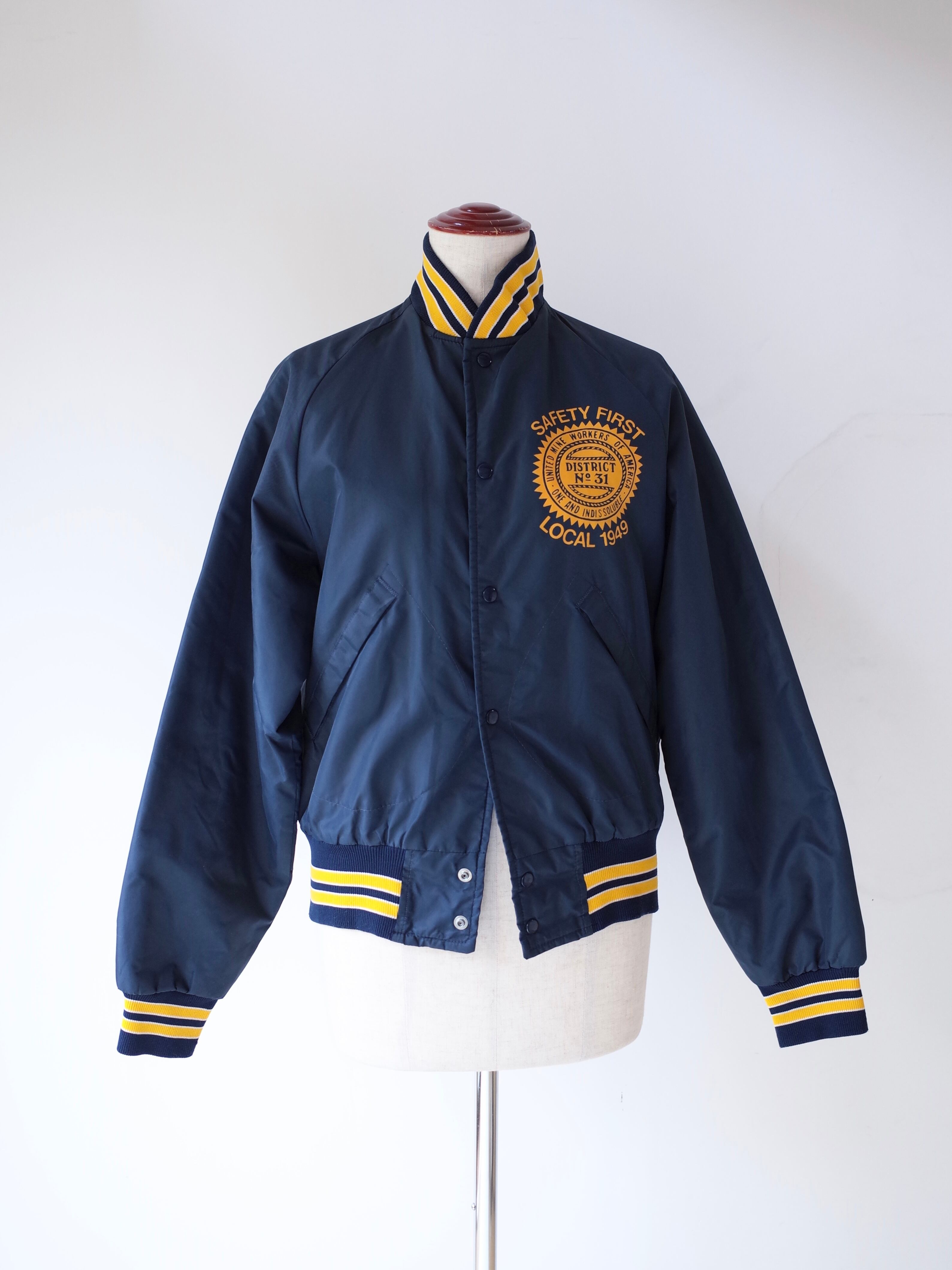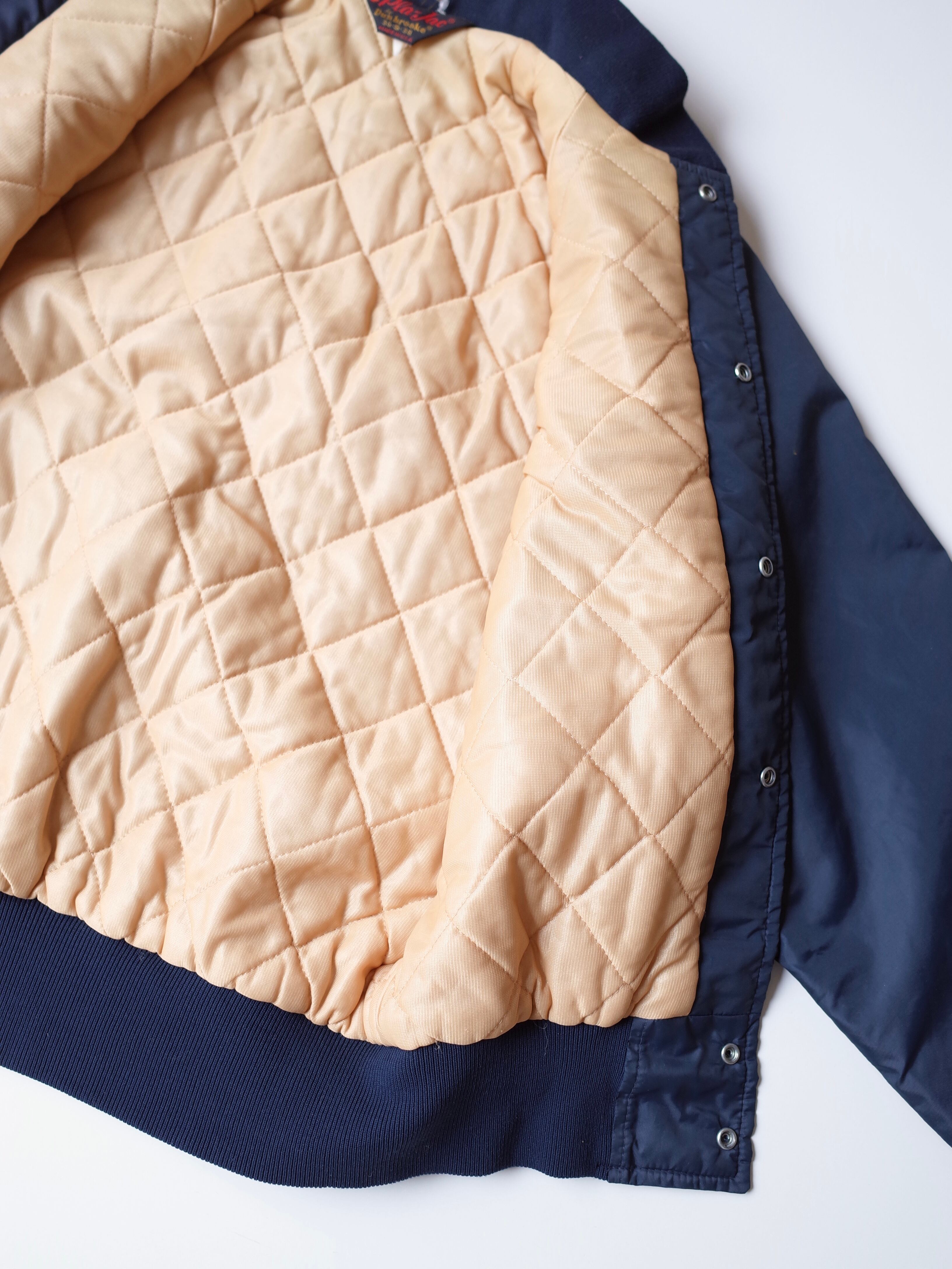 70年代アメリカ製Dunbrookeのナイロンスタジアムジャンパー。定番的でシンプルなデザインの合わせやすいネイビーカラー。内側はキルティング仕様で温かく着用頂けます。スポーツテイストな着こなしにぜひ取り入れてみてはいかがでしょうか。