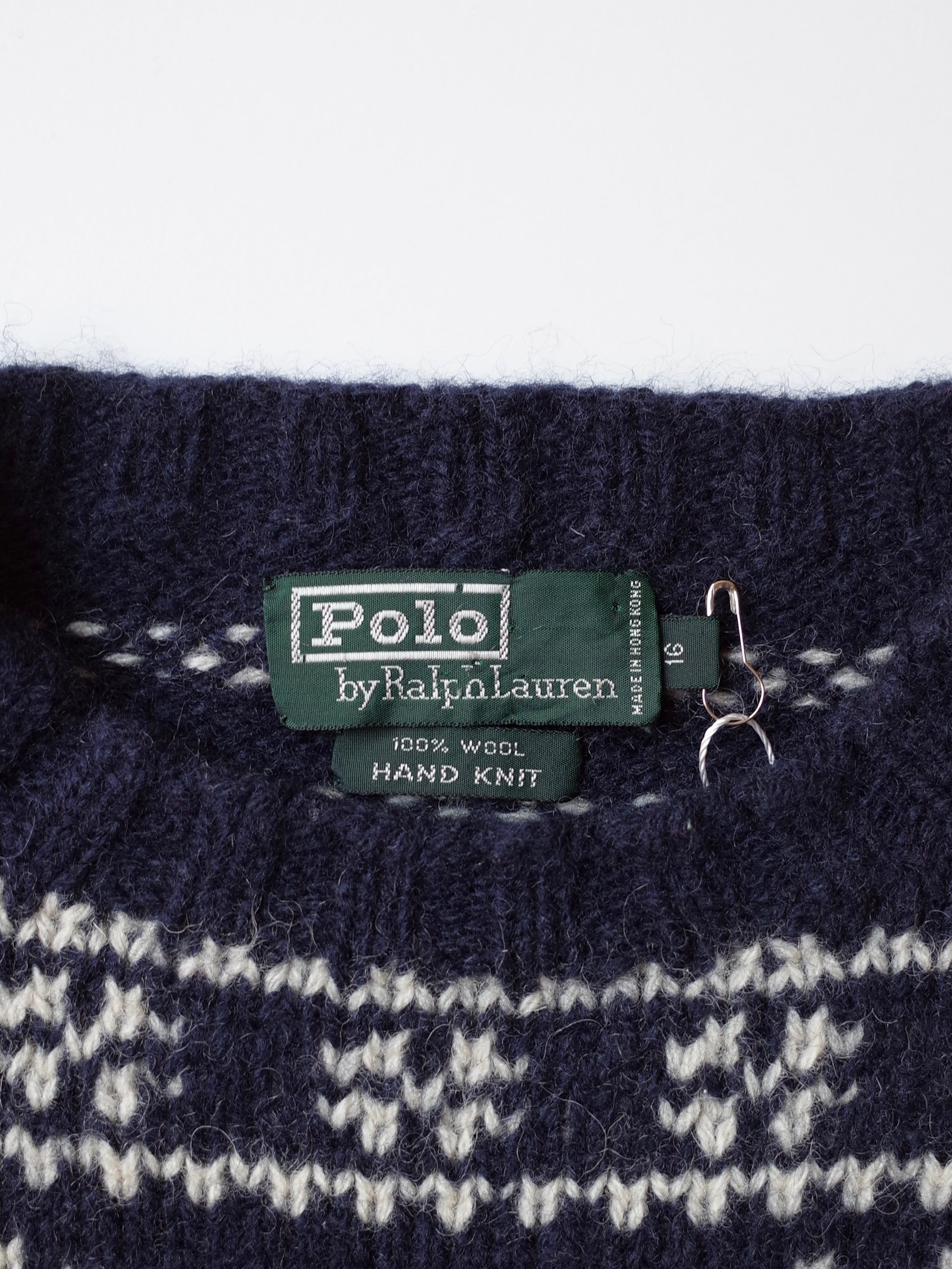 80年代製Polo by Ralph Laurenのノルディック柄セーター。ボーイズサイズですが、女性が着用するのに良いサイズ感です。ネイビー×ホワイトカラーのシンプルで永遠の定番。ハンドニットで温かみと季節感のある一枚です。
