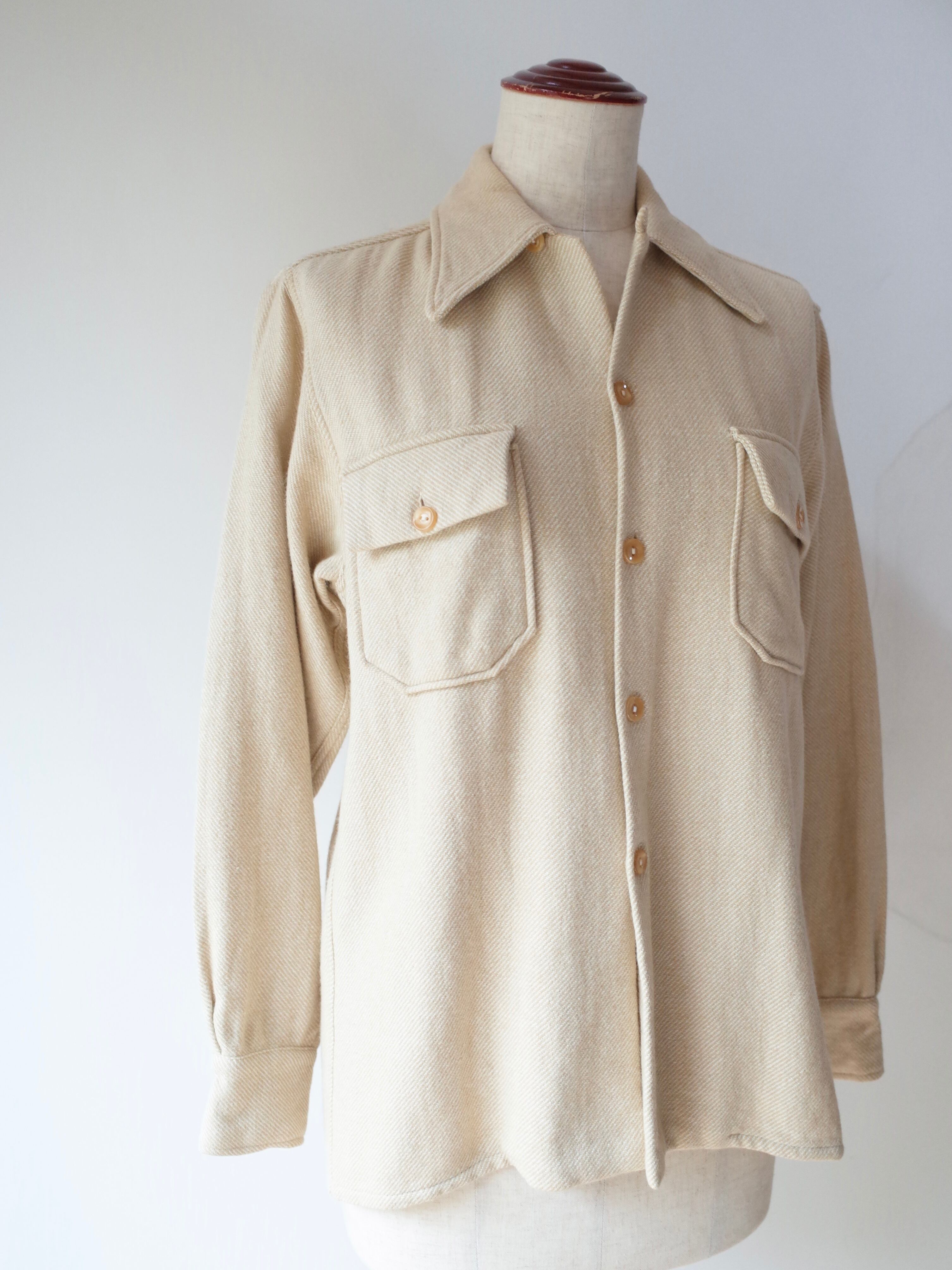 ウール素材のオープンカラーシャツ。ジャケットのようにさらっと羽織れる一枚です。アイロンで襟を抑えれば開襟に。トップボタンを留めて着用してもGOODです◎
