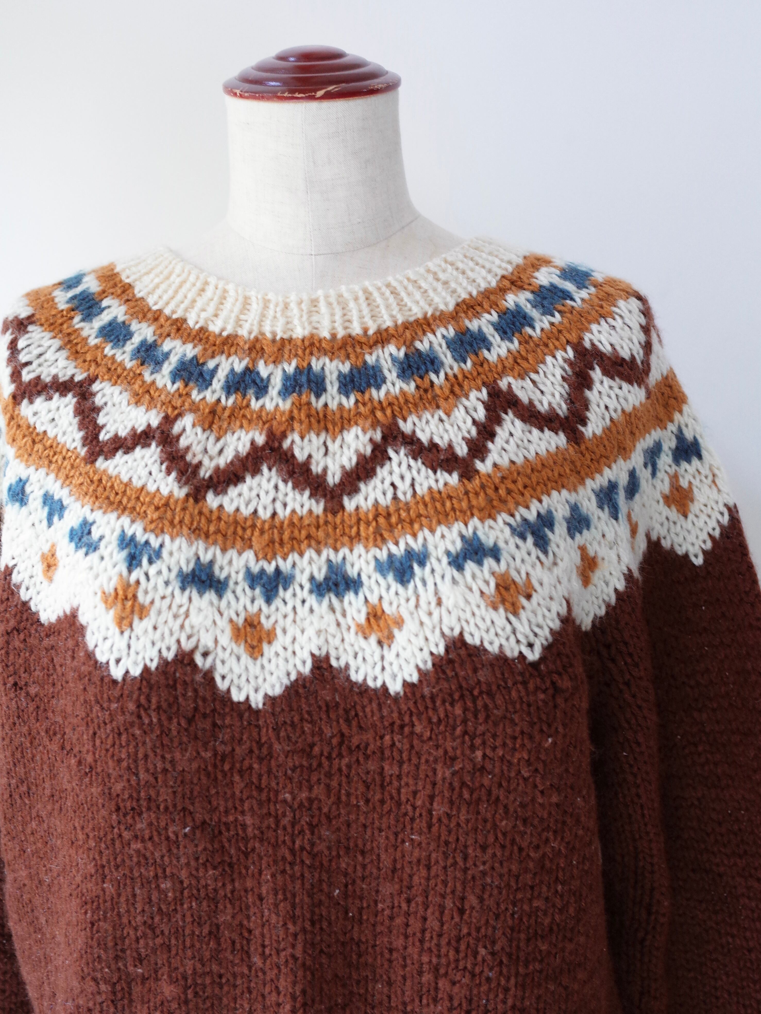数々のブランドからも出されている伝統的なフェアアイル柄ですが、ブラウンやターコイズブルーなどのカラーが目を惹く一枚。今から春先まで着られるローゲージ編みのアクリルニットというのもポイント高いです。一枚で着こなすのはもちろん、シャツやブラウスとのレイヤードスタイルも楽しめるセーターです。