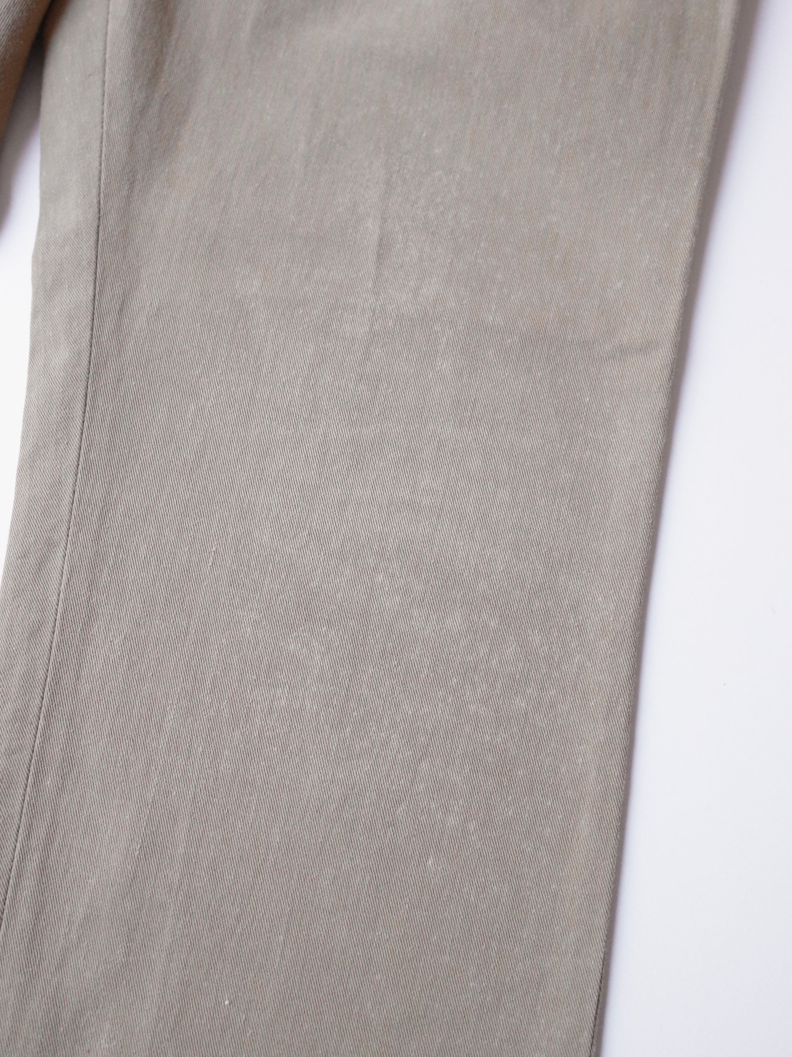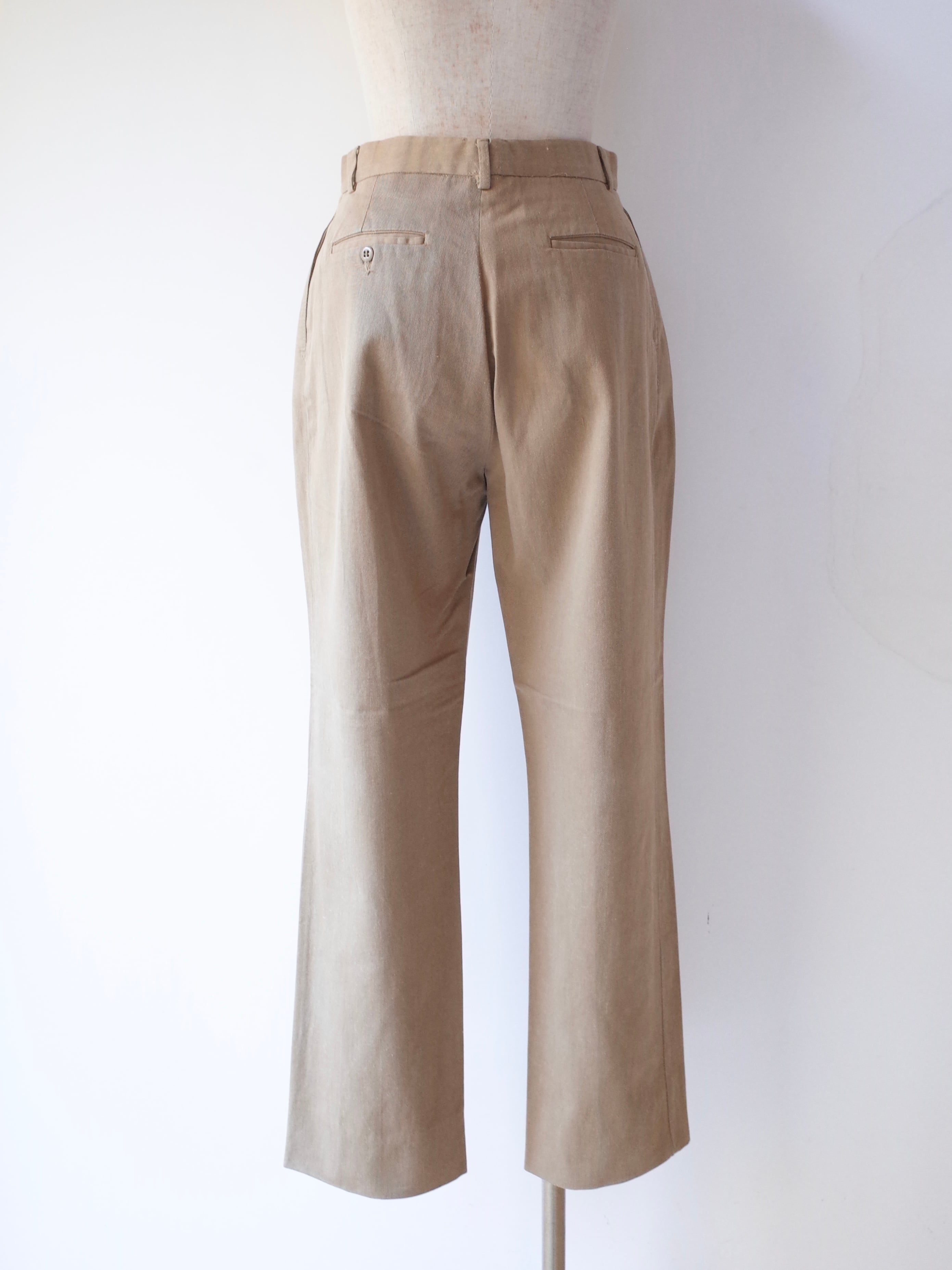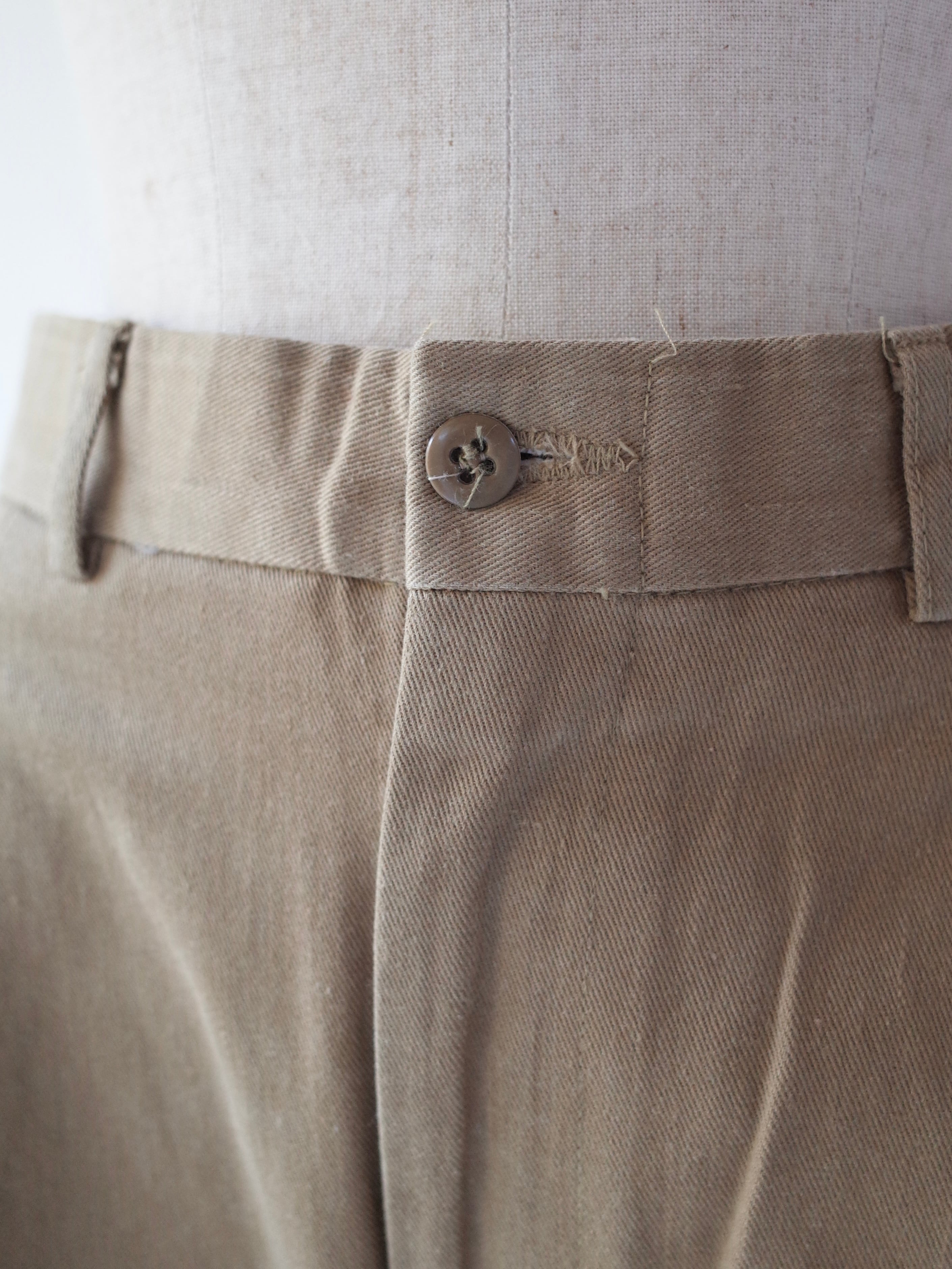 80年代アメリカ製BRITISH KHAKI by Robert Lightonのパンツ。BRITISH KHAKIは、1979年にニューヨークにおいて、ライトン夫妻がスタートさせたコロニアルテイストなブランドです。妻のエリザベス・ライトンの曾祖父がイギリス植民地時代のインドに住んでいたころの生活スタイルがモチーフになっていてます。コットンツイルのしっかりとした生地感に、タックが入ったチノパンです。